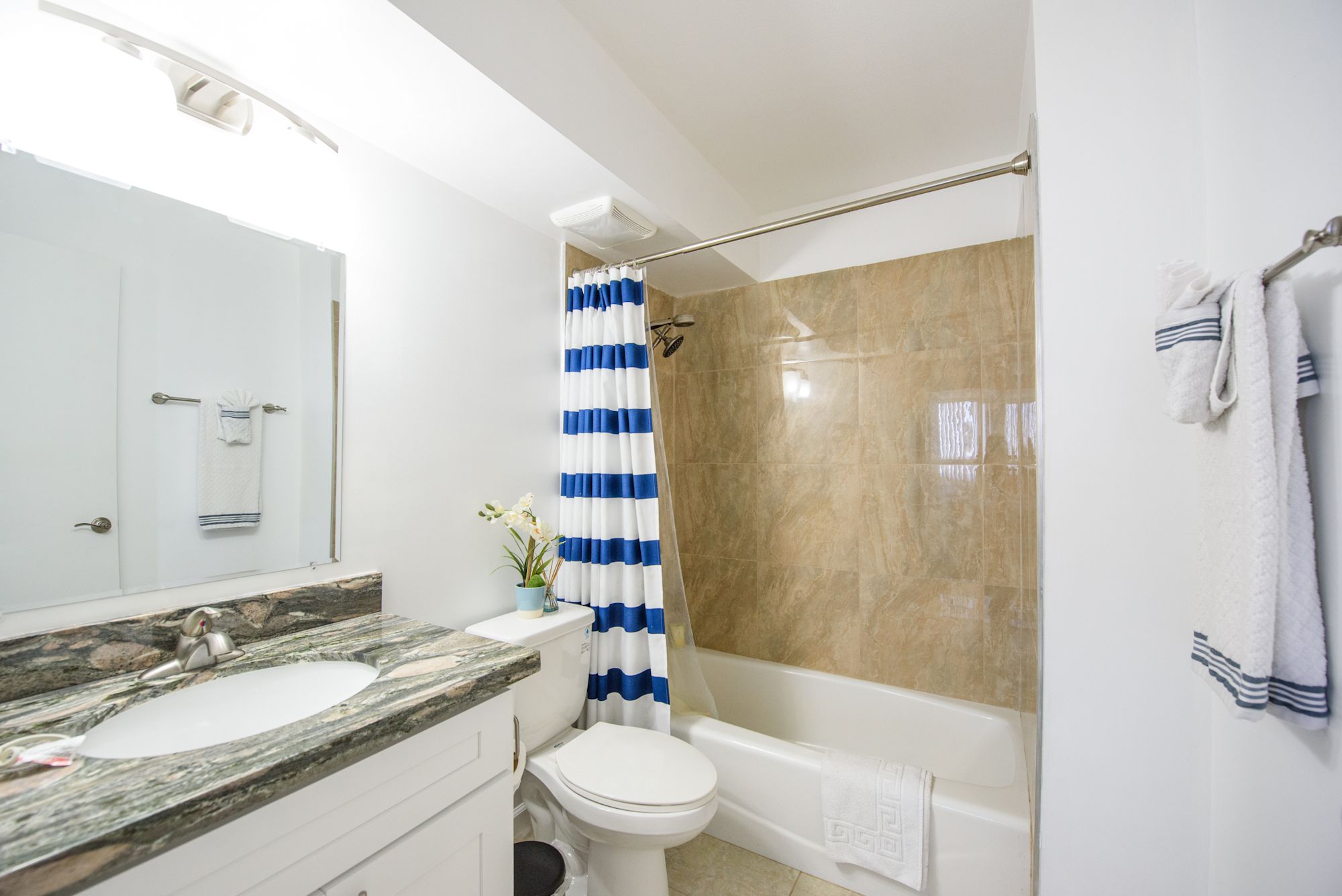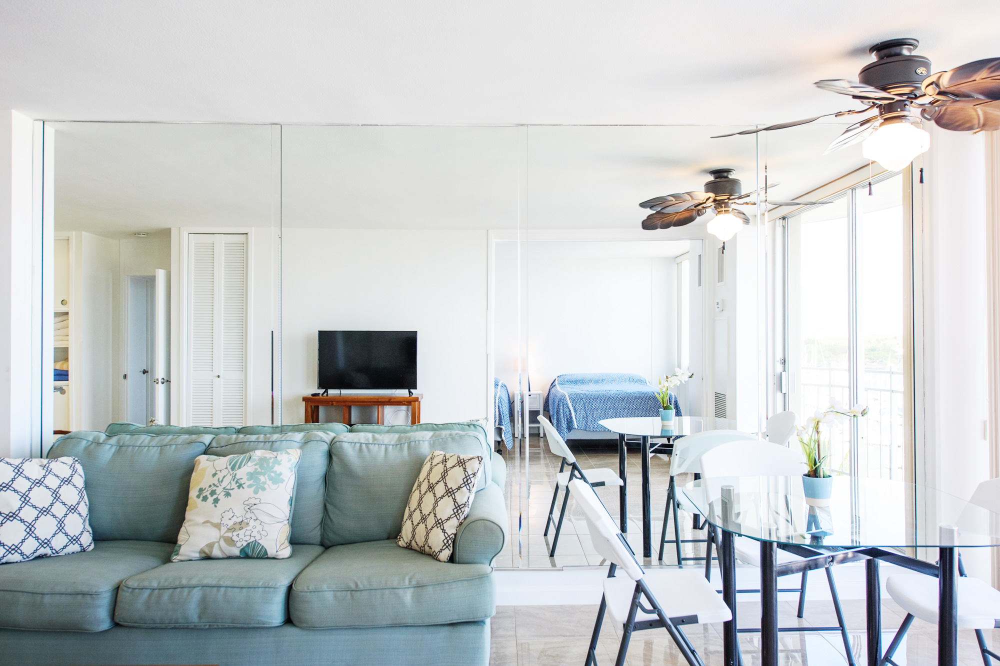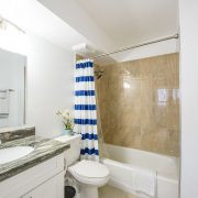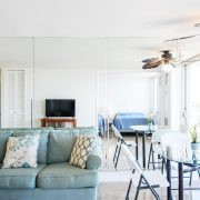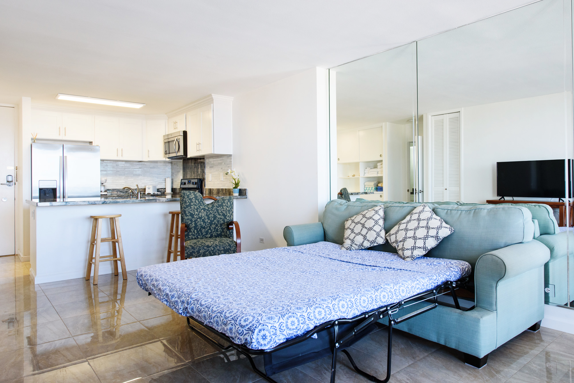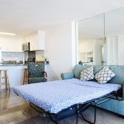 最近改装を終えたばかりの1ベッドルーム。フルサイズのベッド(幅約137cm)2台とクイーンサイズ(幅約152㎝)のソファベッド。フルキッチン、冷蔵庫、コンロ、オーブン、電子レンジ、ブレンダー、コーヒーメーカー、お皿、お鍋など揃えております。エアコン、フラットTV、無料Wifiあり。バスルームにはバスタブ付きです。
