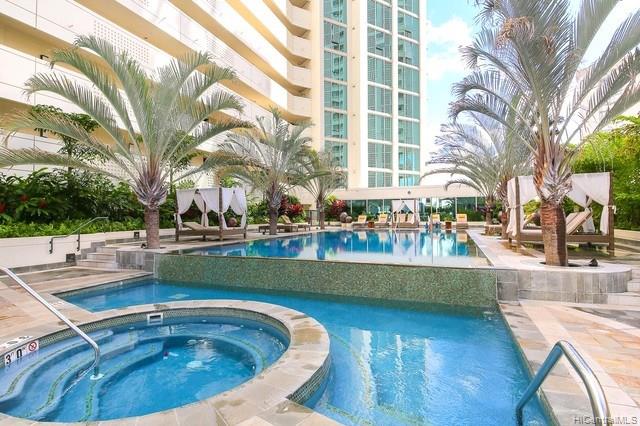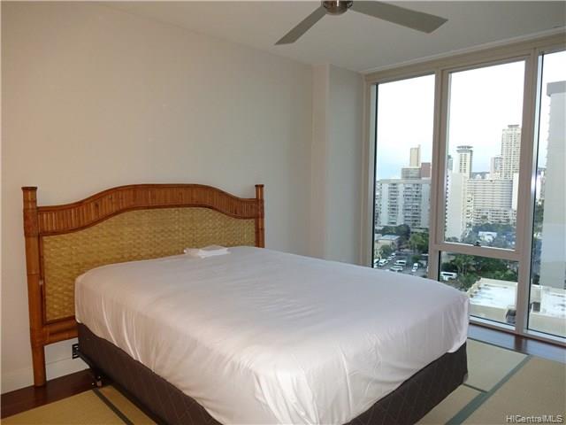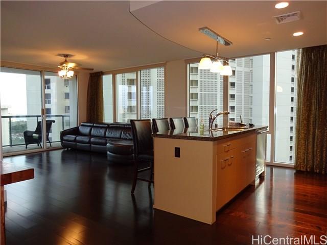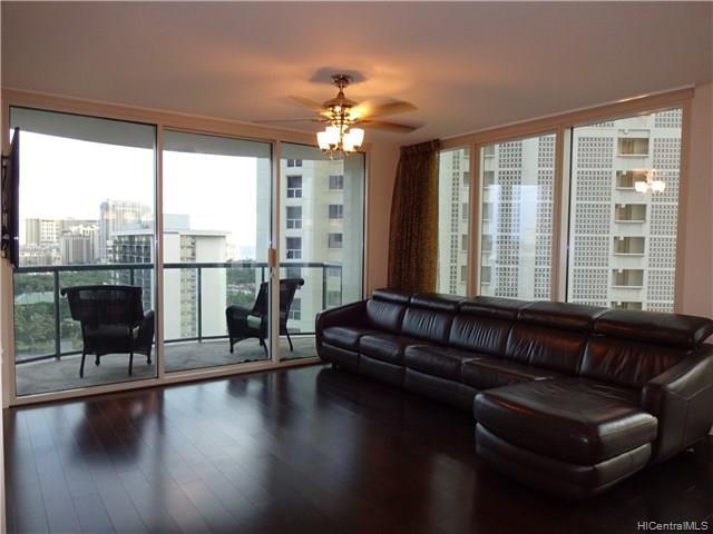 At the very entrance of Waikiki, Sophisticated. Modern. world known ” Kalakaua Ave.” address for you home! This corner, larger 2 bed unit with l views of Waikiki, mountain, and Ocean. Great resort living in a luxury condo in Waikiki with security and amenities. 30 days minimum rental allowed with proper procedures. You can enjoy Sunrise to Sunset from the corner living room.