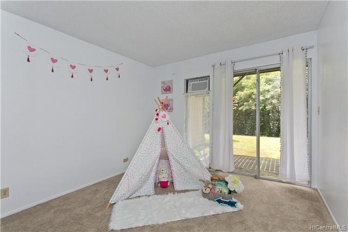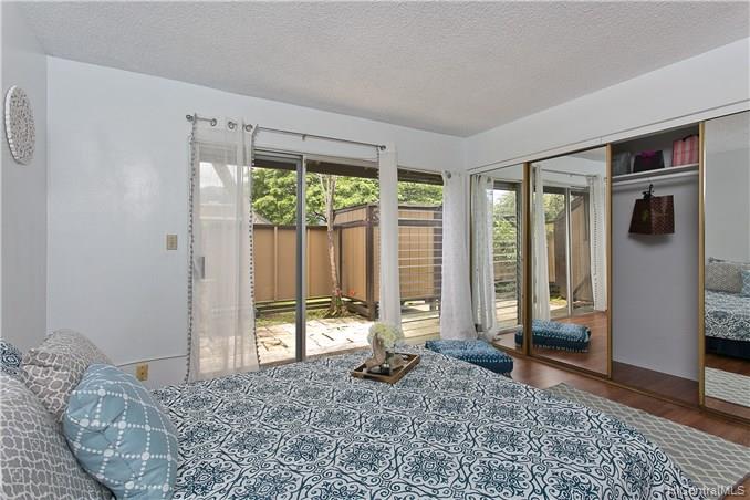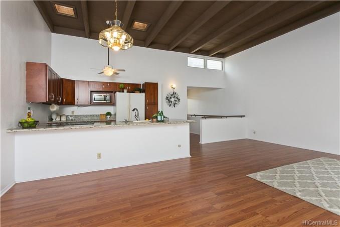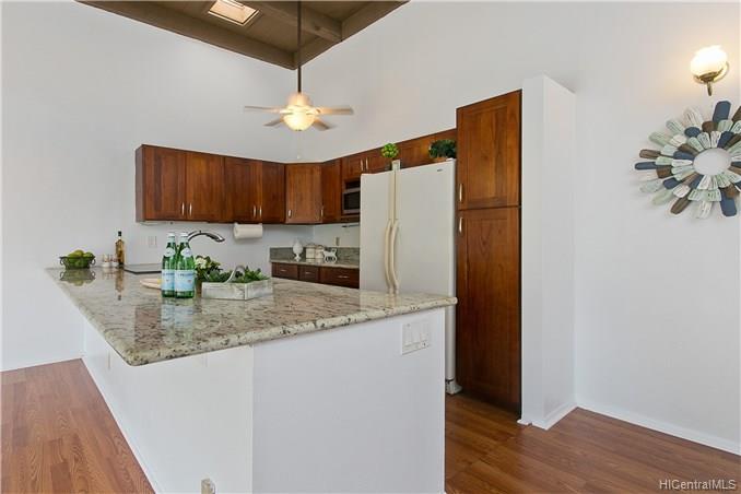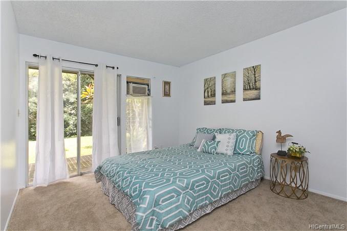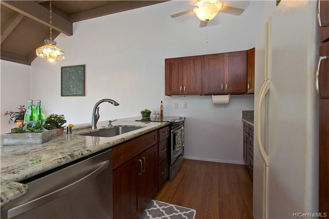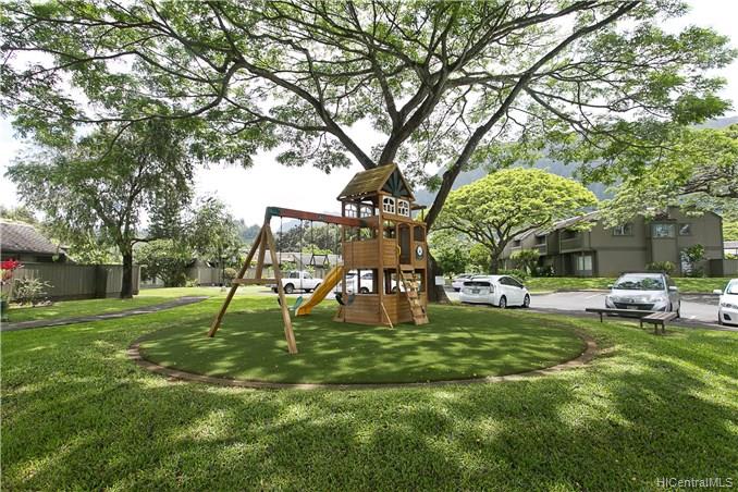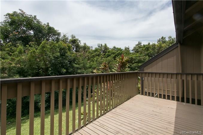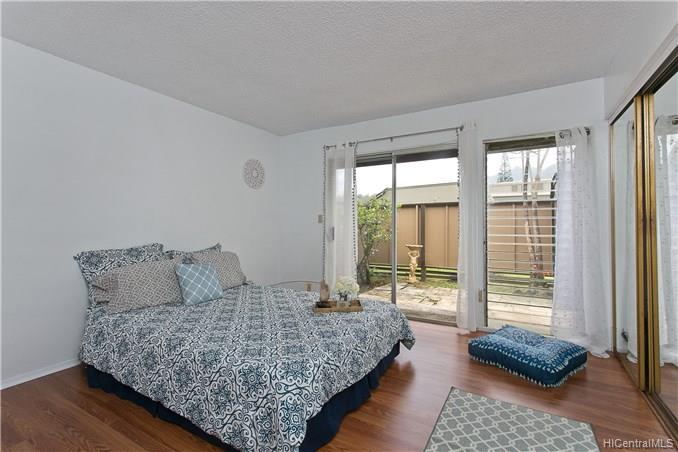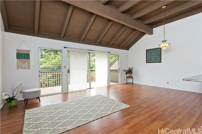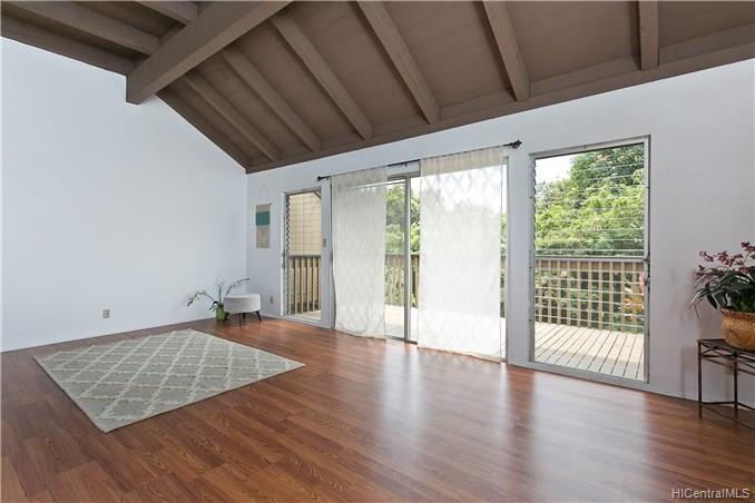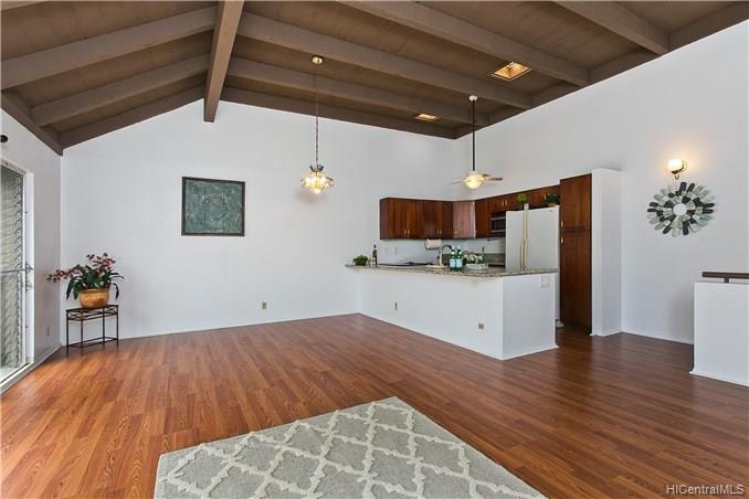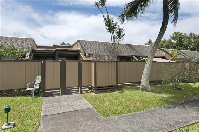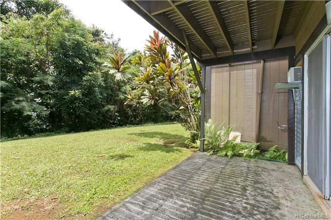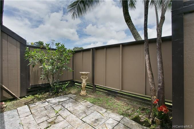 Nestled near the majestic Ko’olau mountains in Temple Valley, this beautiful and welcoming 3 bedroom, 2 bath town home in Club View Garden features a remodeled kitchen that opens up into a spacious living room with high vaulted ceilings that looks out onto your very own large patio! A green garden setting view with no town home in the back of you which makes it feel very private. New laminate flooring in living, kitchen and first floor area and new plush carpet in the downstairs bedroom area. Extra large storage room downstairs & a storage closet area at entrance of home. Grow your own spices, herbs & flower garden in your own private courtyard off of first floor bdrm! Come home & relax in this beautiful home with large interior sq. ft. of 1,321 sq. ft. A must see! OPEN HOUSE 6/3 Sun 2-5!