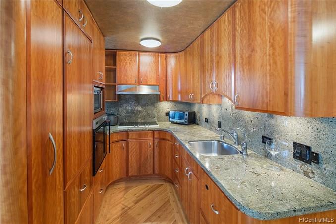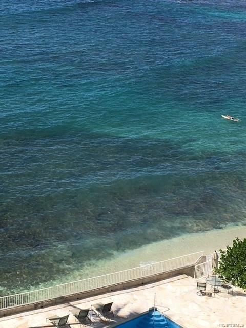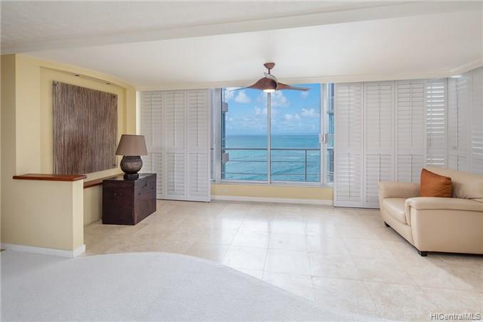 Elegant oceanfront 2-bdrm/2-bath unit with approx. 1693 sq. ft. of interior living space, custom cabinets, large master suite, Den/murphy bed for guests, plantation shutters, gourmet kitchen and appliances. Washer/Dryer in unit. Partially furnished. High floor, Diamond Head, Kapiolani Park and Ocean views. Great NEW Price!