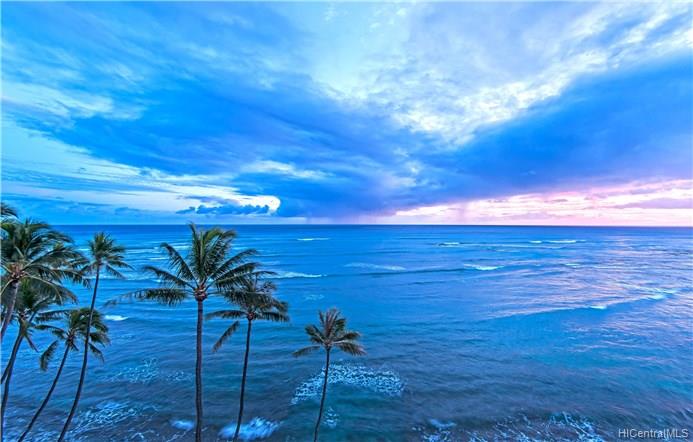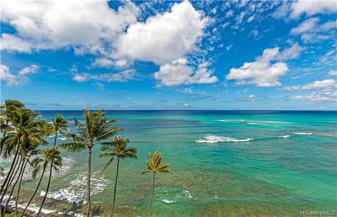 Rarely this 3 bedroom, over 2,200 square feet gem with stunning 270 degree views of the ocean, Diamond Head and Waikiki is available. This beautifully designed and renovated unit has two covered parking stalls and is in the finest building on the Gold Coast: Offers the largest frontage on the ocean, heated pool, and tranquil garden with an area to BBQ. Quiet resort design with surf board and bike storage. This Ossopoff design was featured in the Honolulu Art Academy, and continues to be the most sought after building on the Gold Coast. For additional photos and virtual tour, please visit: https://vtours.in1view.com/1048428?idx=1