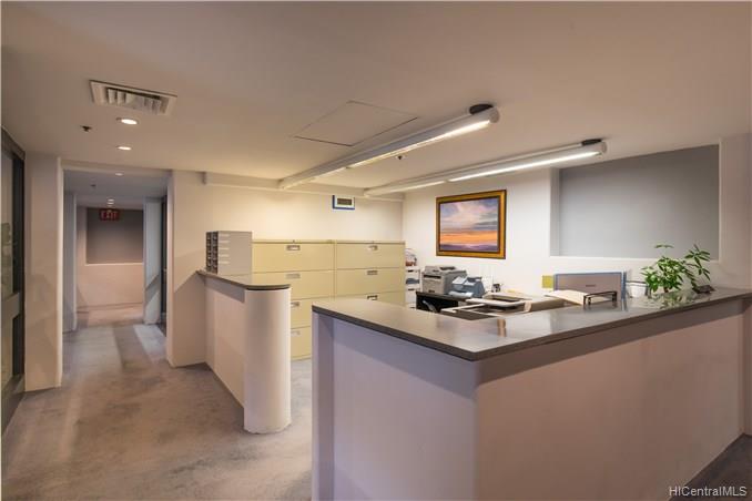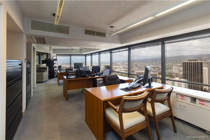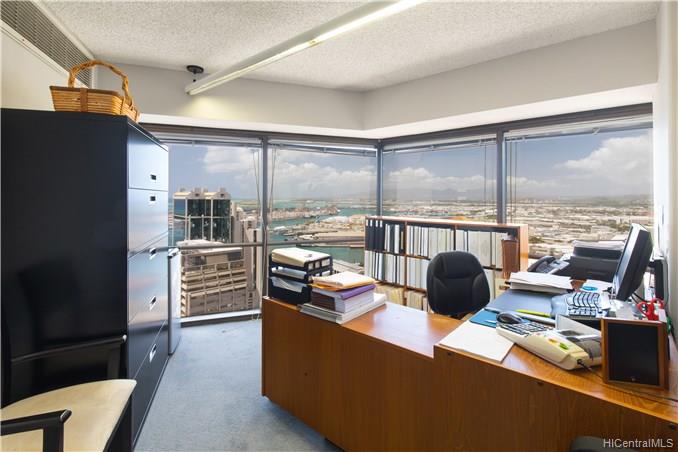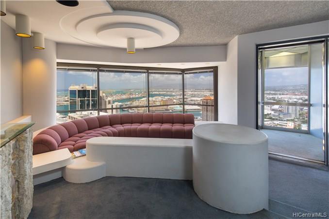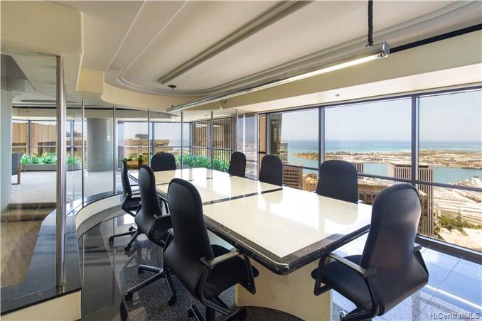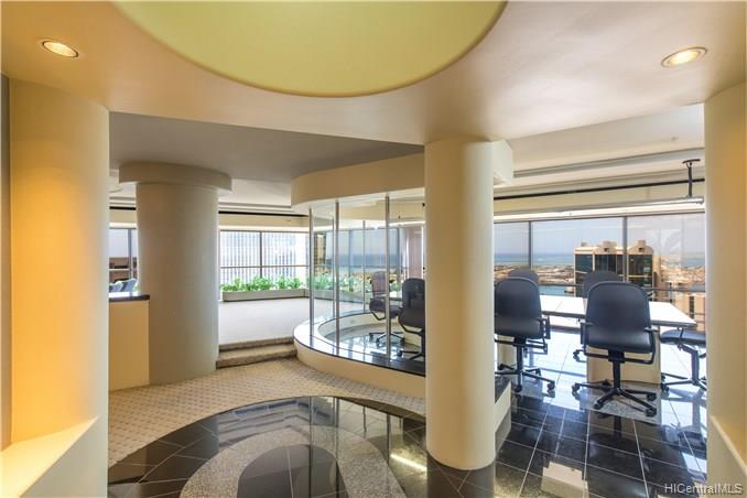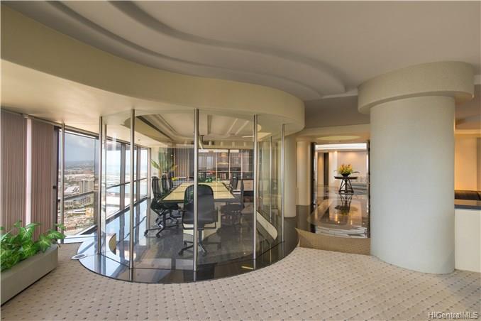 Live, work, and play in the heart of downtown Honolulu in this fee-simple Sky Penthouse at the Executive Centre. Enjoy 360-degrees of floor-to-ceiling unobstructed views from sunrise to sunset. This unique property truly has it all: private lobby, office space, and meeting rooms, as well as private living quarters, wine room, sauna and parking for both your guests and your employees. Envision your life with no commuting and with the luxury of having your work place on the same floor as your living area or simply make this your private residence. Remodel on living area has begun and buyers can add their personal touch. You’ll enjoy the shopping and dining of Chinatown, the conveniences of downtown and even put your guests up in the building’s hotel units – downtown’s only hotel.
