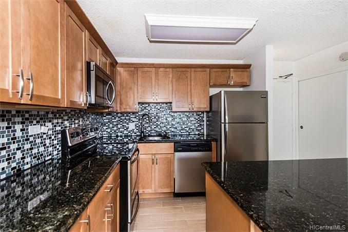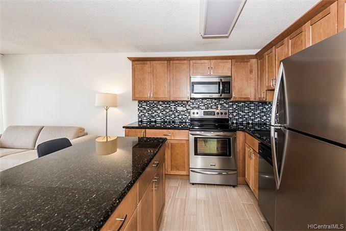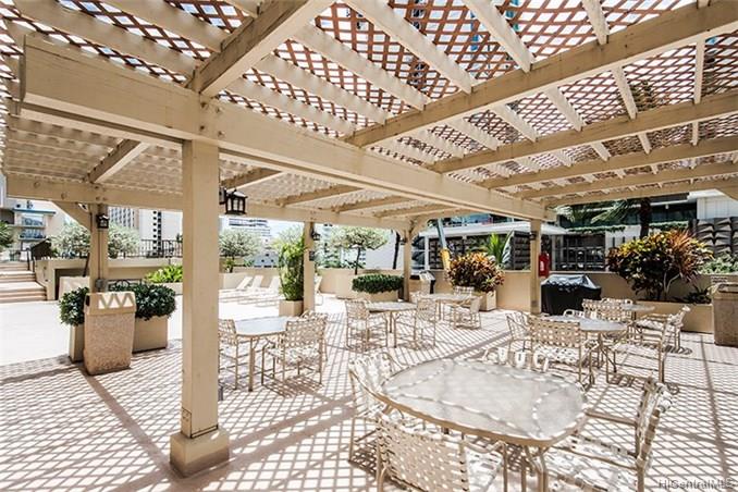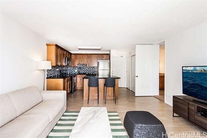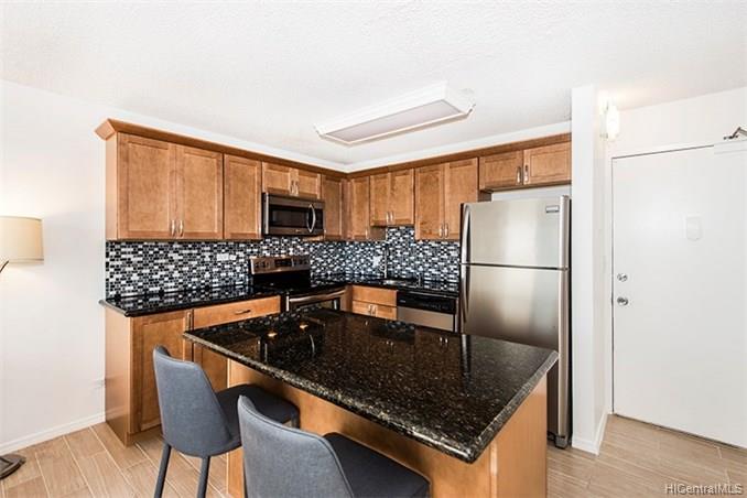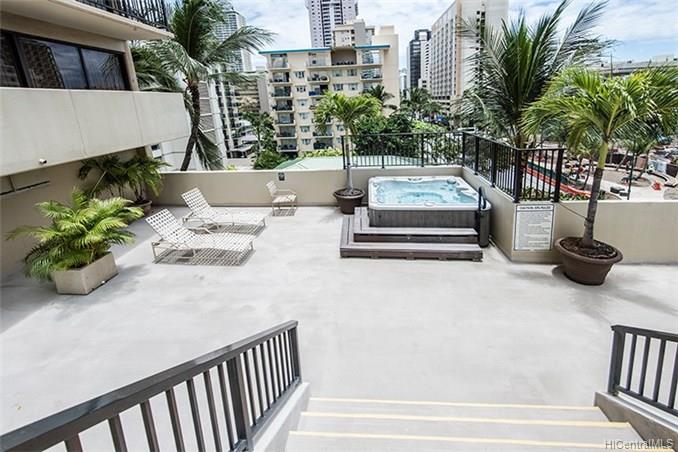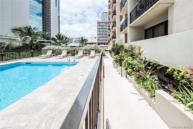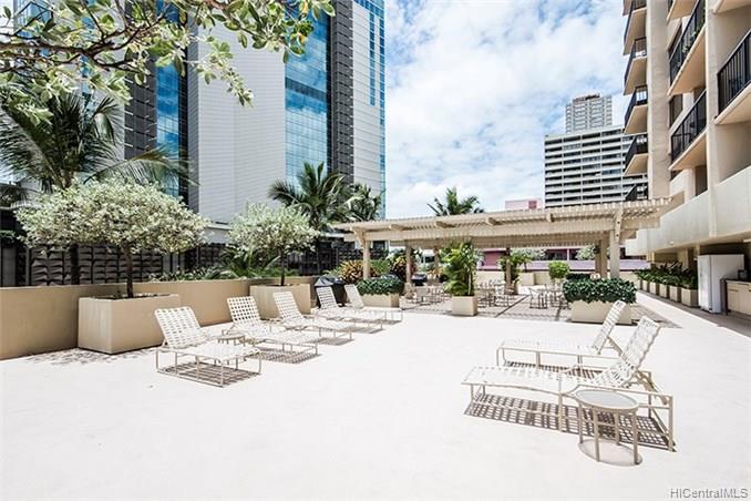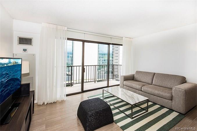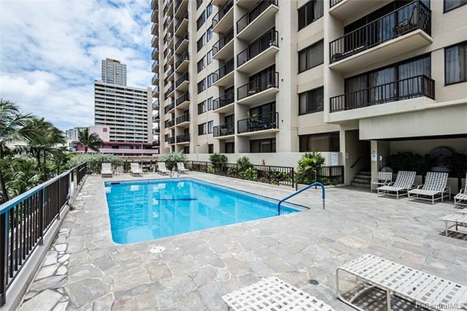 Fully furnished corner unit one bedroom with excellent condition and ready to move-in or rent out. Partial ocean view from the unit. Located in the heart of Waikiki and in close proximity to many shops and restaurants. Newer ceramic flooring throughout and carpeting in the bedroom. Full kitchen with custom kitchen cabinets, granite countertops, stainless steel appliances. Great amenities like pool, barbecue area, outdoor dining, hot tub, sauna, 24-hour security, designated covered parking, and storage locker. Washer and dryer in unit and pet-friendly. Enjoy the Waikiki lifestyle!