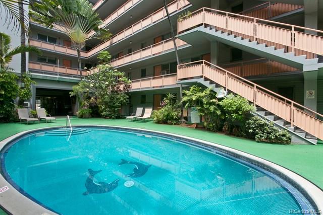 Ground floor fully renovated unit with large lanai. Secured building, direct access to pool with nice Hawaiian feel, convenience store and restaurants on premises. Fully furnished unit not in the hotel pool with stone flooring, sold built in Maple cabinetry with murphy bed. The building allows for short term rentals. In the heart of Waikiki, walking distance to new International Marketplace, the new Lay Low & Hyatt hotels, and other various redevelopments throughout Waikiki. Property has been featured on Hawaii 5-O.
