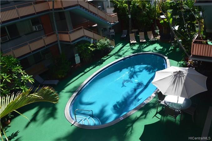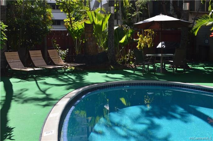 Located in the heart of Waikiki, just steps to the International Marketplace, Duke’s Lane Eatery, shopping, nightlife, and Waikiki Beach! Daily rentals allowed in this boutique building with the easy-going vibe of a Hawaii past. Lounge or BBQ poolside surrounded by tropical landscaping after a day around town. Unit has been upgraded over time with wood laminate flooring, granite counter-tops, tiki bar-height peninsula, and full glass top range/oven.
