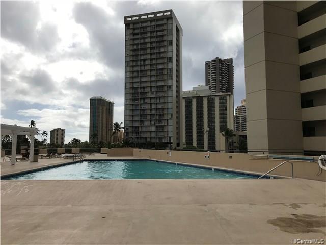 Near Convention Center, Waikiki. Swimming pool, whirlpool, sun deck, BBQ. Fitness center. Coin operated laundry. 24 hour security. Breakfast/Brunch restaurants in bldg. Car rental. Property management office on 5th floor. Ewa view of partial Ala Wai canal. No appliances, TV included. Maintenance fee: $284.92, Hotel: $9.03, Reserve: $27.75, Total: $321.70
