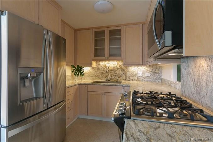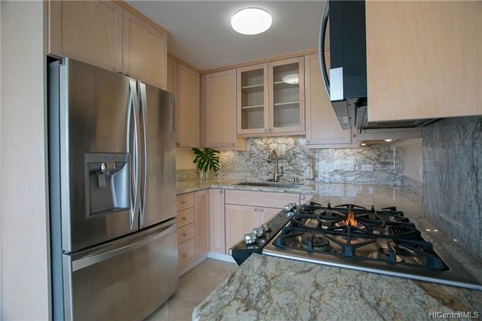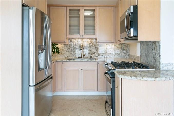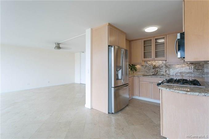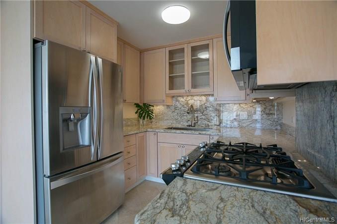 Rarely available 3 bedroom 2 bath 1 parking in the heart of Kapahulu – Beautifully upgraded with travertine, wood floors, maple kitchen cabinets, granite countertop and stainless steel appliances. Bathrooms with Toto toilets & whirlpool tub. Enjoy the lanai with roll up door – great location. Enjoy the convenience of living in town; walking distance to Safeway, shopping and dining areas. City and Diamond Head view from the living room. Turnkey, don’t miss out on this opportunity! Seller is doing 1031 exchange.