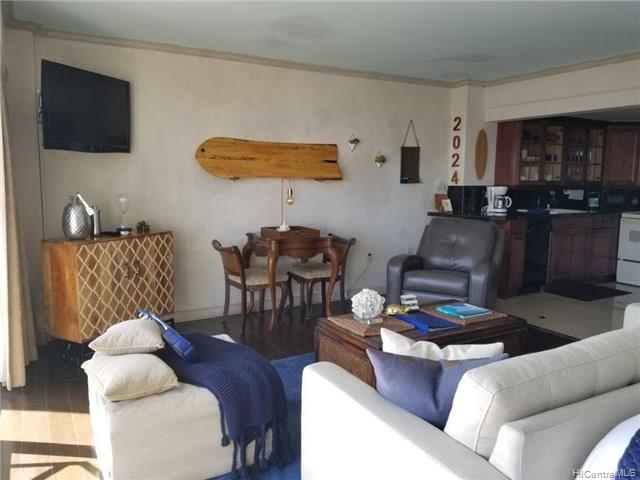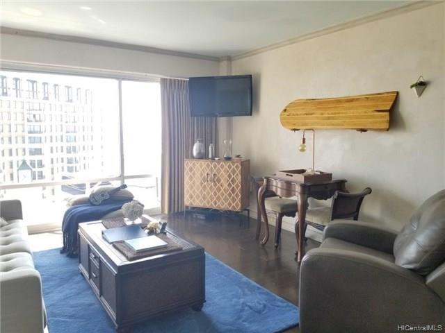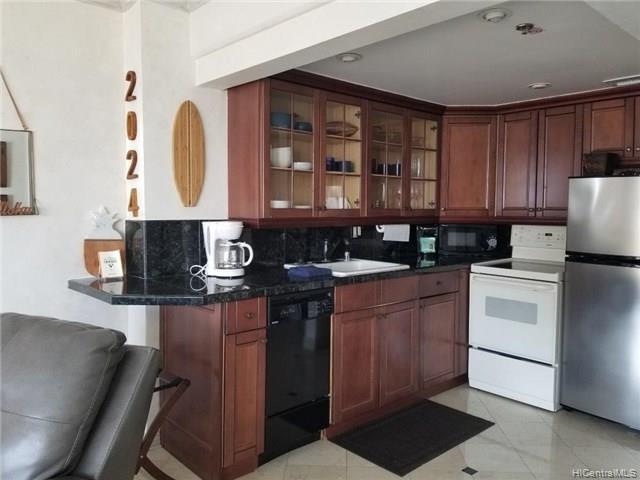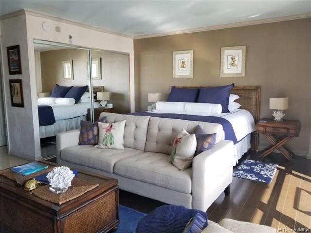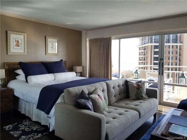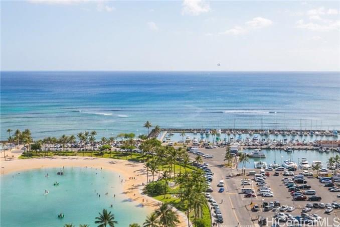 Enjoy fabulous ocean and lagoon views. Rarely availabe high floor remodeled 1-bedroom with exquiste furnishings. Bright open kitchen with granite countertops. Watch Friday night fireworks weekly from your specious lanai. Great amenities: Heated swimming pool, Resturant, Coffee & Gift Shops, Dave’s ice cream shop and more. Close to Ala Moana Shopping Center & Magic Island. Excellent location.