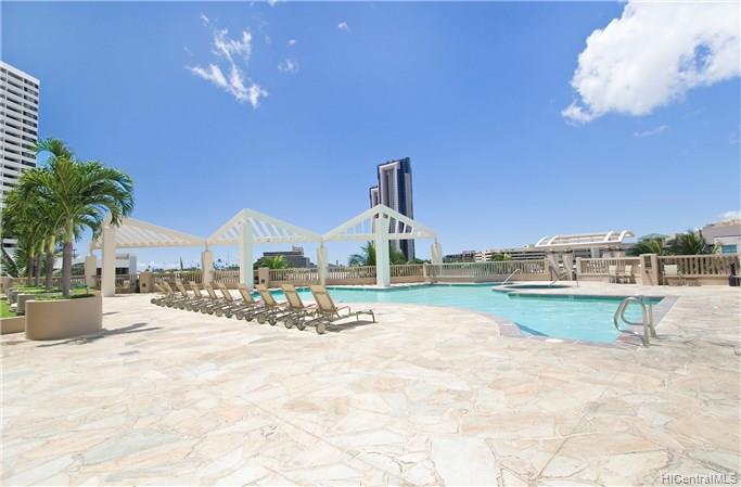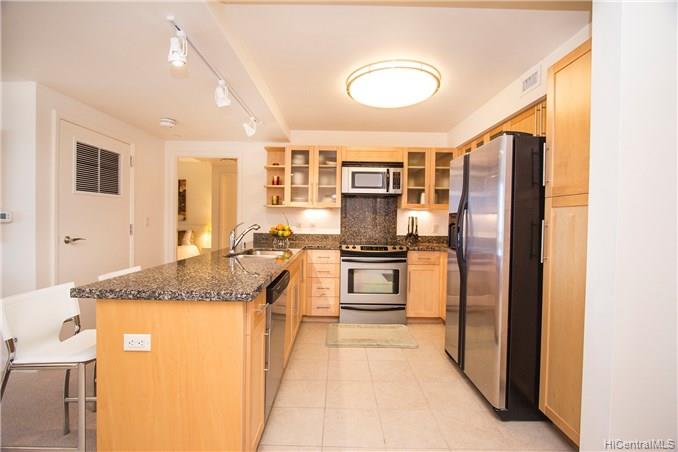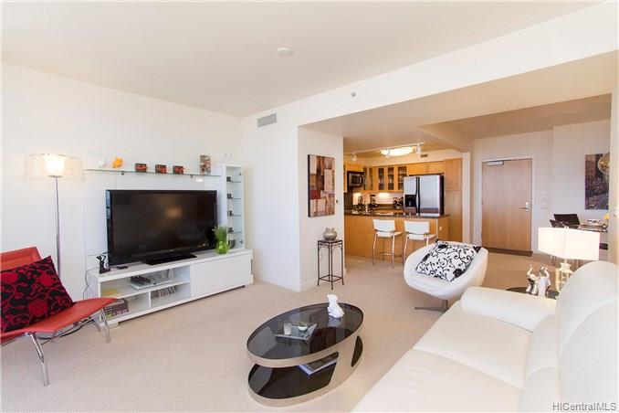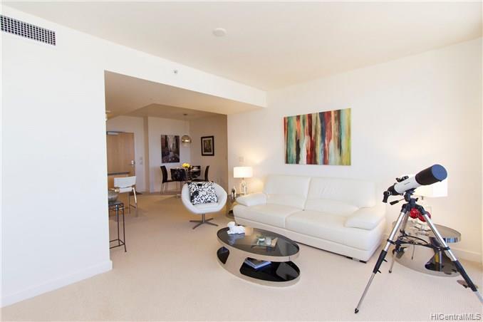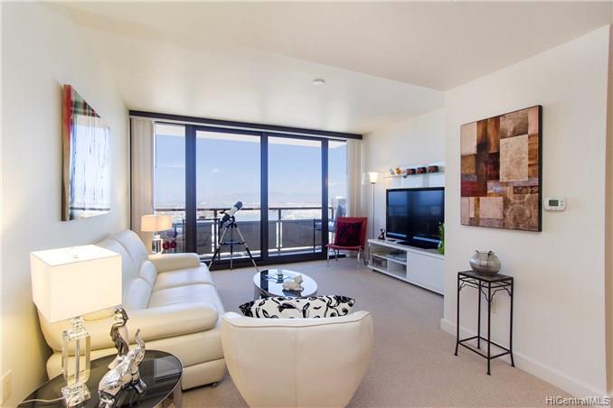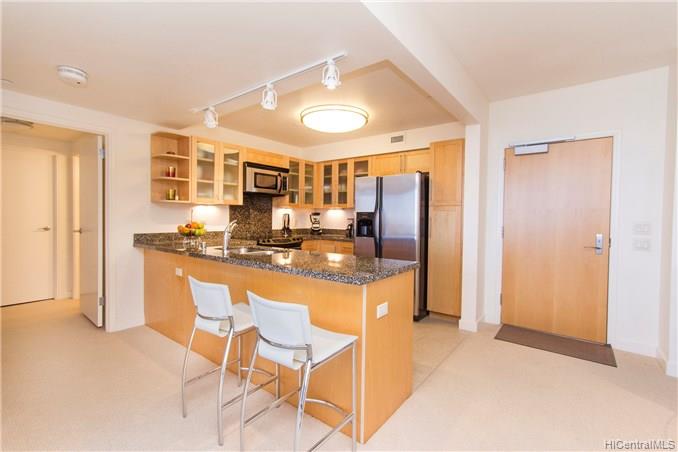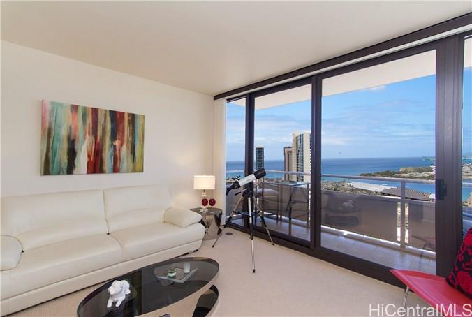 Enjoy luxury living and spectacular views of the ocean, coastline, harbor, city and the sunset from this 36th floor 2 bdrm 2 bath unit with lanai. Quality is found throughout from granite counter tops, wood cabinetry, 8’6’ ceilings, central AC, separate dining area. Well maintained and move-in ready. Amenities include whirlpool, pool, fitness center, BBQ area, and much more.