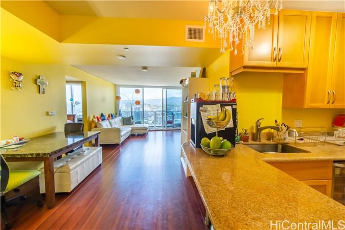 Wonderful opportunity to own a high floor upgraded East tower unit in the very popular Moana Pacific. This unit uniquely has a 43 sq ft lanai where one can enjoy cool mountain breeze and enjoy beautiful city views. Recently remodeled with wooden flooring and features an open kitchen, granite countertops, and built in fridge. Maintenance fee is reasonably low despite the numerous amount of great amenities such as Recreational area, restaurant, tennis court, theater room, and so much more! The location is excellent close to Ala Moana, Ward Village, and Waikiki.