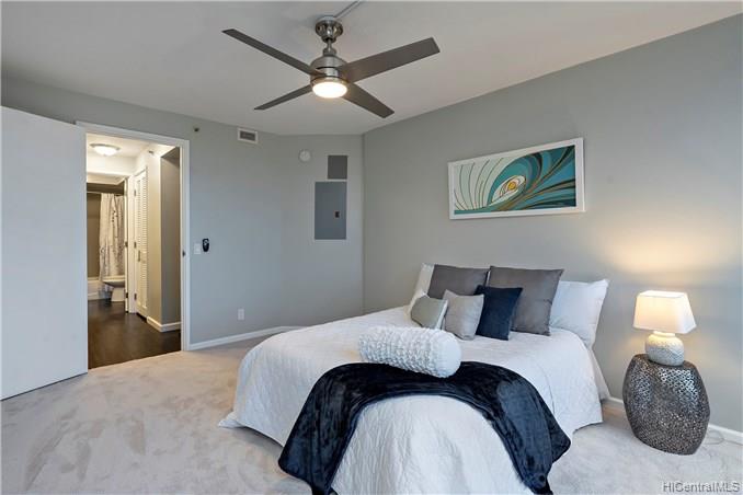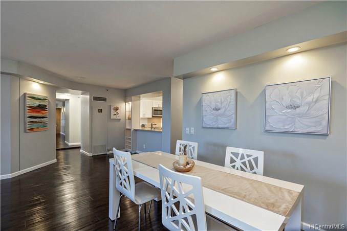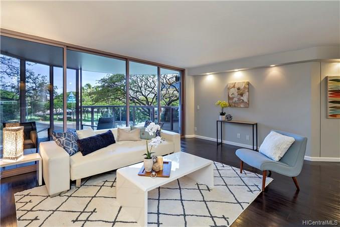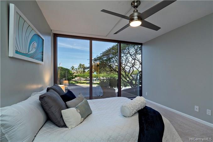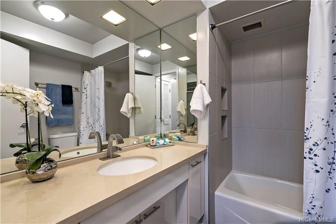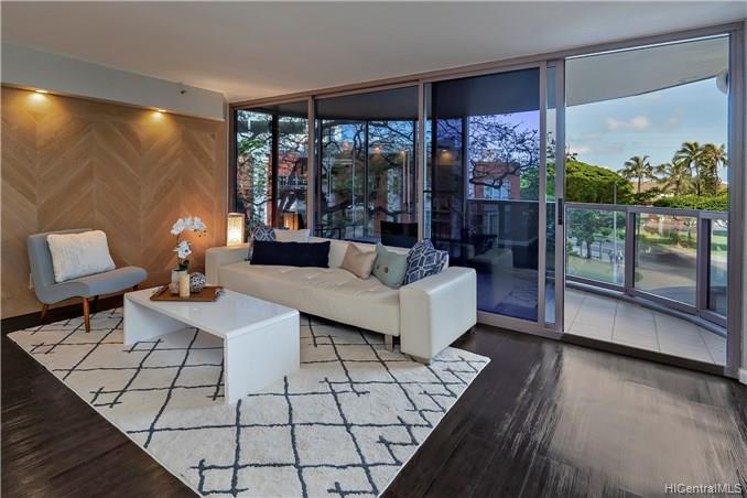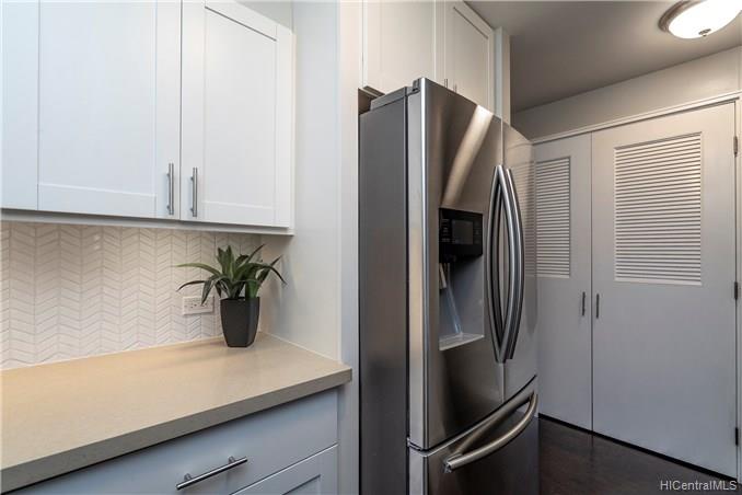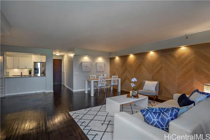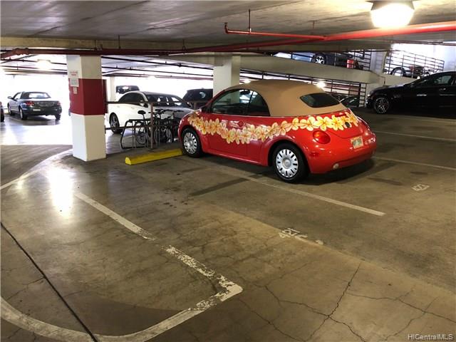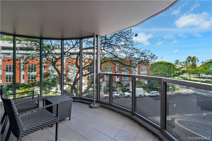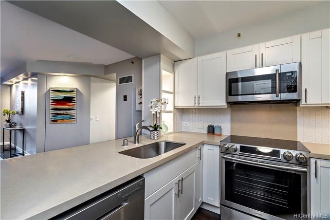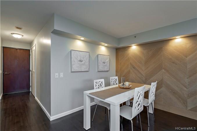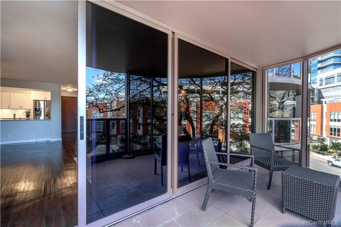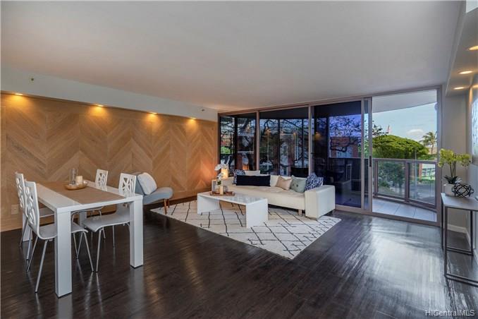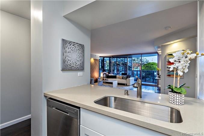 Completely remodeled unit with peaceful and cool tree top views. The parking is on the same level as the unit! Super convenient, amazing location with SALT, Restaurant Row and all of Kakaako’s new attractions just outside your door. Brand new solid wood kitchen cabinetry, quartz counter-tops, under cabinet lighting, custom built-in wine racks with back lighting, water-resistant vinyl planking floors and a custom reclaimed wood accent wall.