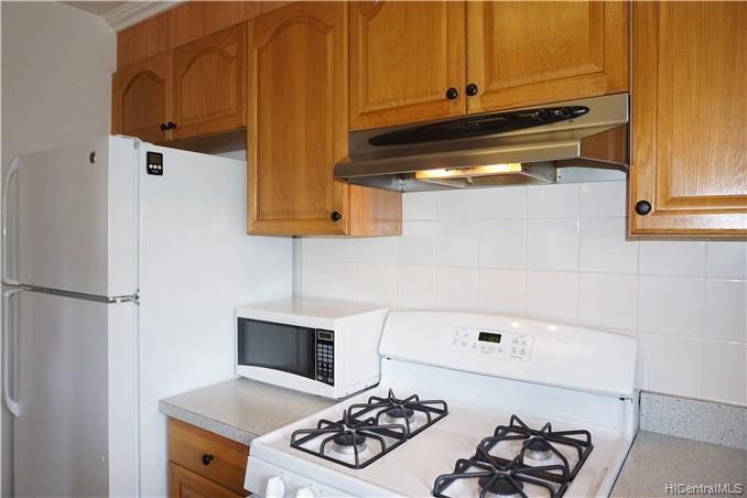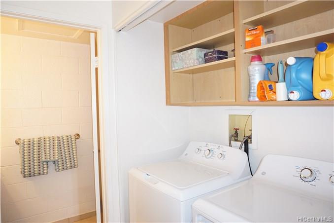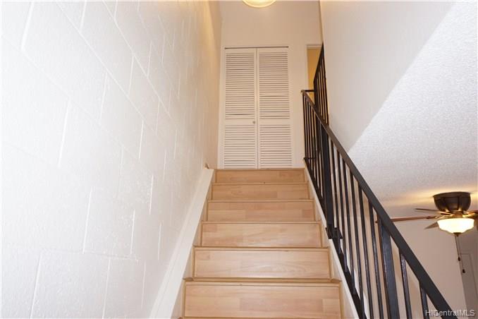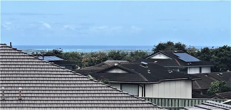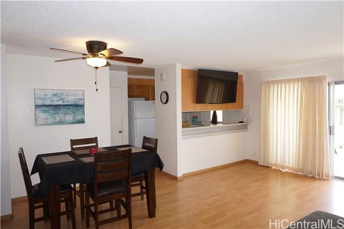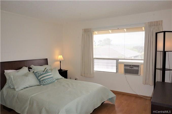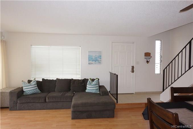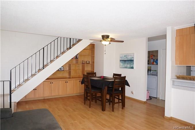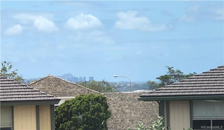 Rarely available corner-end 3 bedroom 1.5 bath. with large enclosed patio with mountain, diamond head and ocean views from upstairs bedrooms. Home features wood laminate flooring throughout, ceramic tile in baths, new gas range, dishwasher and washer and dryer and newer ceiling fan. 3 A/C units in bedrooms, 2 end parking stalls, 1 covered and one open. Lots of guest parking. Close to shopping, restaurants, bus line.