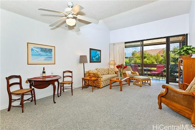 Enjoy the Kailua lifestyle in this 2 bedroom, 2 bath apartment in the heart of town. Walk to shops and restaurants or Kailua Beach. The living room features cathedral ceilings and clerestory windows. Fourth floor unit with nice breezes and mature landscaping outside. Both bathrooms have been recently updated. Two covered parking plus storage locker. Building amenities include pool and entertaining areas surrounded by lush tropical landscaping.