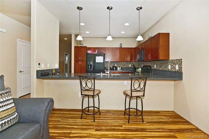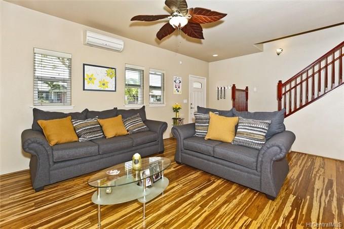 Amazing Pulewa at Mehana development in Kapolei! Popular 2 story townhouse floor plan with lovely finishes including tiger bamboo flooring on the first floor, stainless steal appliances and granite countertops. The 3 bedrooms are all upstairs which includes a very spacious master sweet with a walk-in closet! All bedrooms have split a/c systems and ceiling fan’s. There is Fenced yard and patio with sprinkler system and an attached one car garage plus one tandem parking space. Walking distance to schools including the New Hookele Elementary School. Minutes to Kroc Center, shopping area and restaurants – Target, Costco, Walmart, and the New Ka Mahana Ali’I Shopping Center. Community features Club House, pool, playgrounds, basketball courts, walking/bike paths and dog parks.
