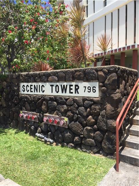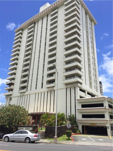 Location! Location! Location! Highly desired Scenic Tower unit with 1 bedroom, 1 bath and 1 parking. Awesome view of Diamond Head from large lanai area. Recently painted, new flooring, range/hood, window AC, bathroom vanity and more. Well maintained and secured building with pool and recreation area. A Must See!