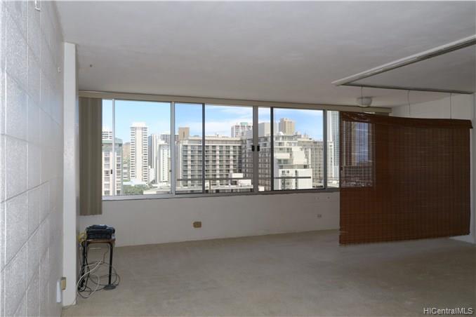 Desirable high floor one bedroom apt. in popular Seaside Towers. Sweeping views of the mountains, golf course, and some ocean. Only morning sun exposure. Bedroom area now open to living room but can be enclosed to be a separate bedroom area. Great potential for remodeling into your dream home in the sky. Very large windows were replaced with new custom windows about 5 years ago. Wonderful opportunity to put your own creative talents to work. Costs to renovate varies greatly. Seller is very open to lower offers to discount partially for these costs. Washer and dryer in the kitchen. Secured building and parking garage. Resident manager, large lobby area, pool, gas BBQ grill with picnic table, lobby restrooms, bike parking, surfboard storage racks on ground floor, and storage locker.