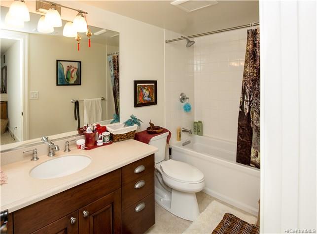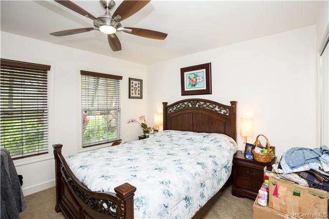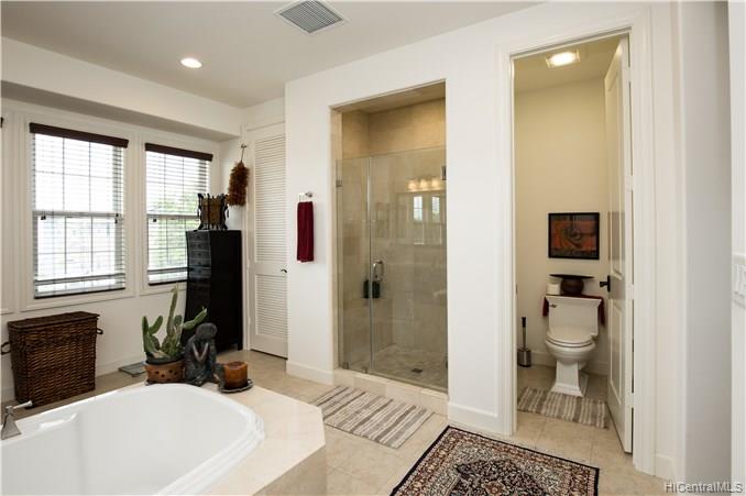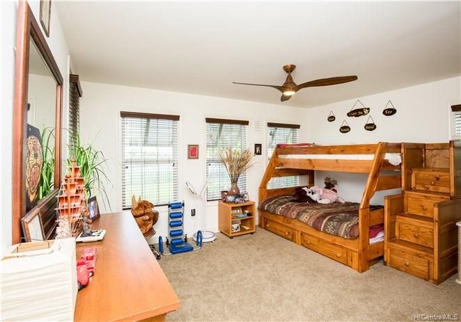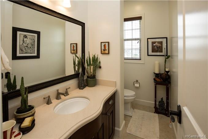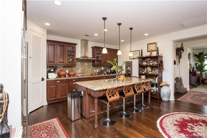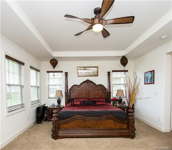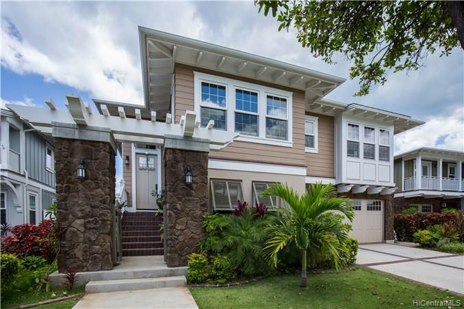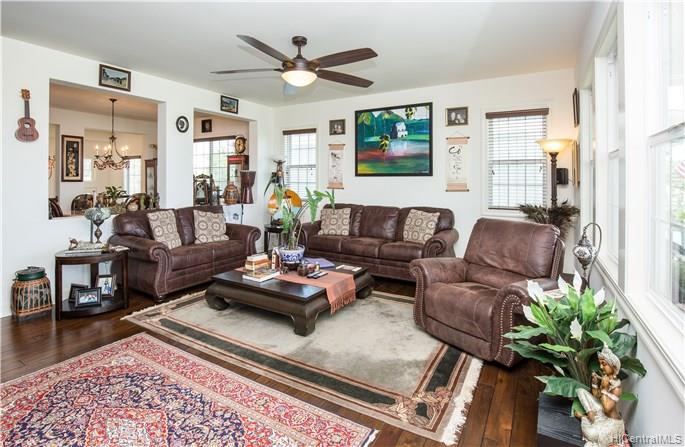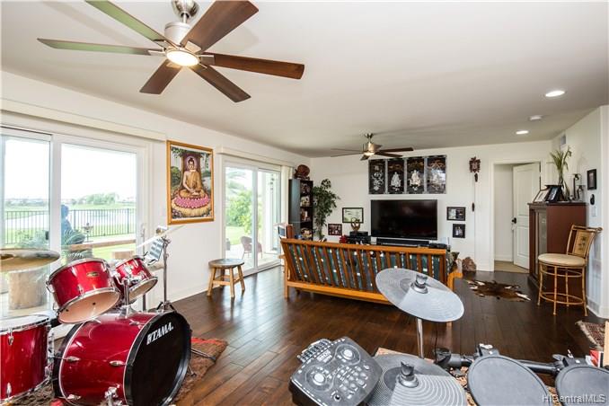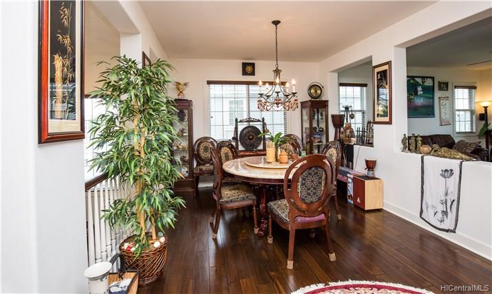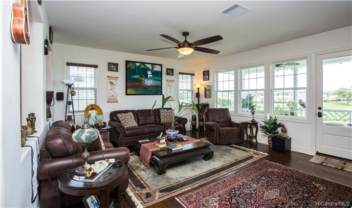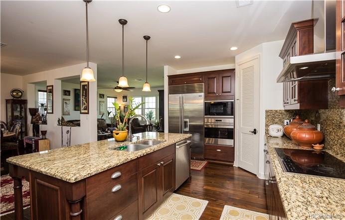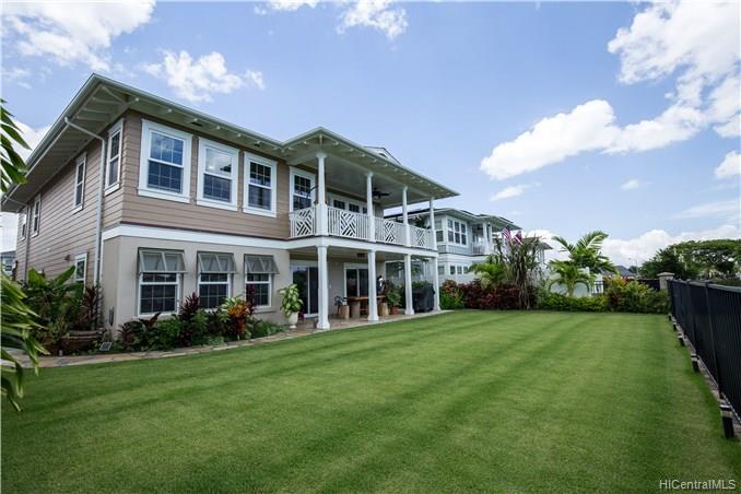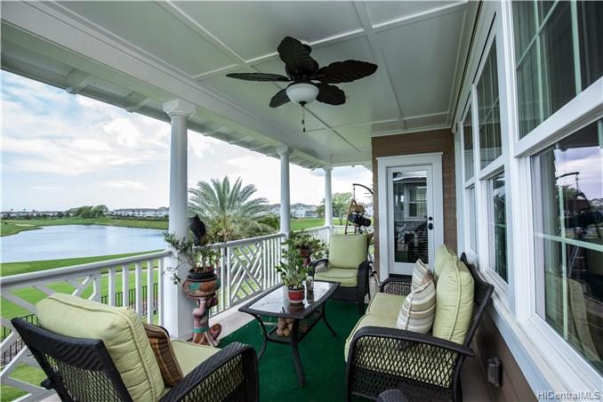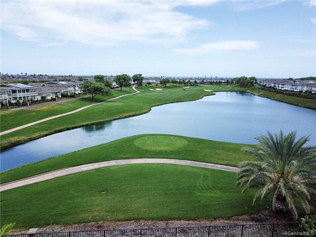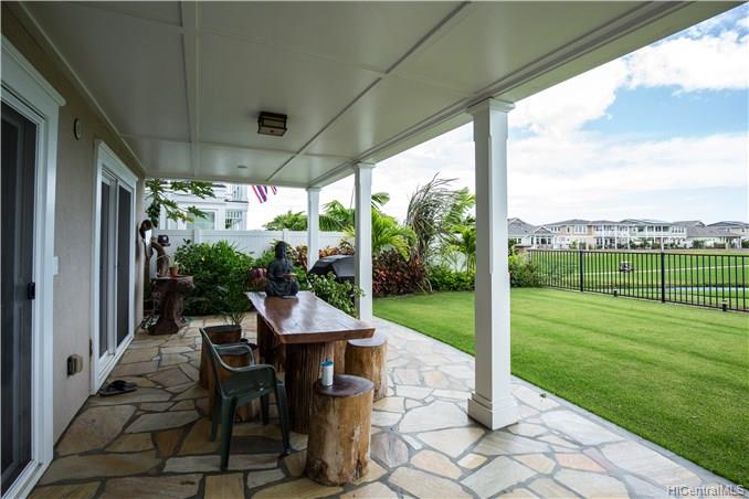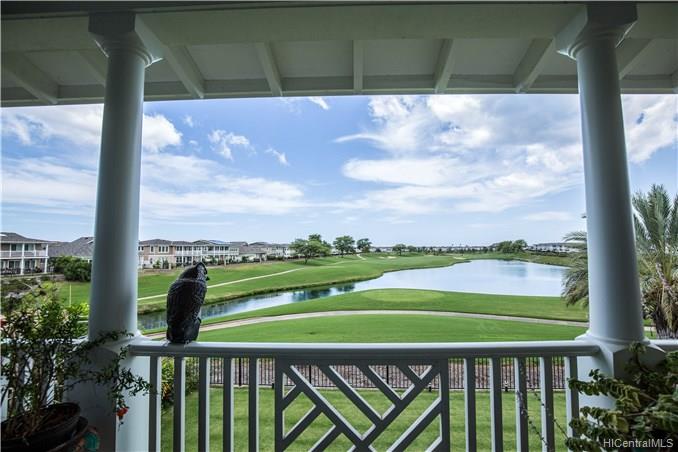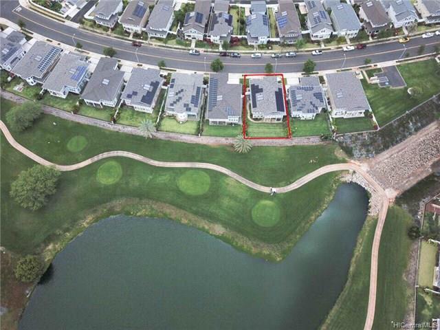 Rarely available 6020 Koa series Golf Course home in Kuapapa at Hoakalei. Spectacular golf course and lake views from the custom flagstone lanai and covered balcony. Hardwood floors upstairs and down with upgraded carpeting in bedrooms. Expansive master suite with his and hers closets. Super-sized family room on first floor, perfect for pool table, can easily convert back to original four bedroom design if desired. SubZero & Wolf appliances, granite countertops with full granite backsplash, spacious laundry, dual-zoned central AC. Owned 40-panel photovoltaic (PV) system for minimal electric bills. HOA fees include high-speed internet, phone & basic cable, plus community pool access and exclusive Wai Kai Lagoon membership.