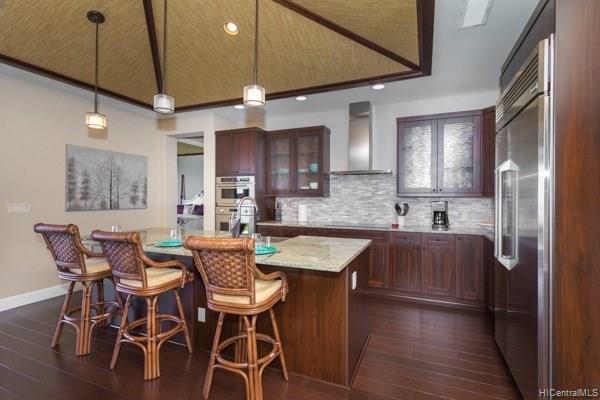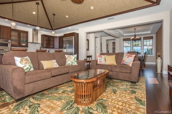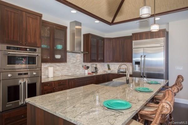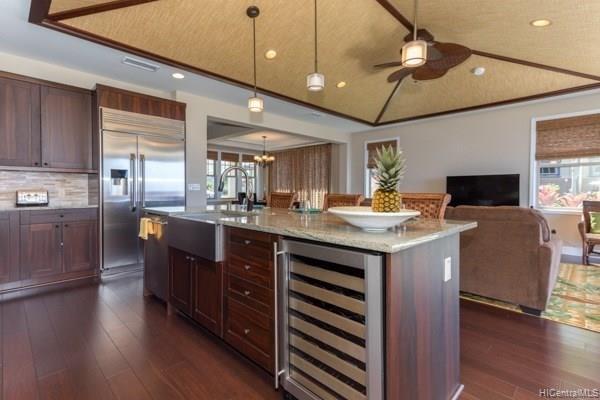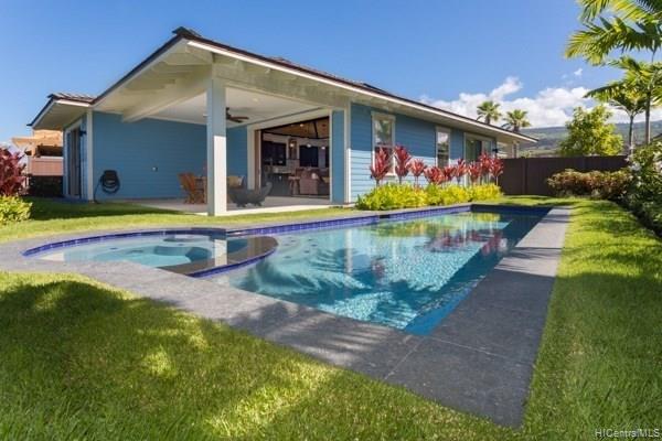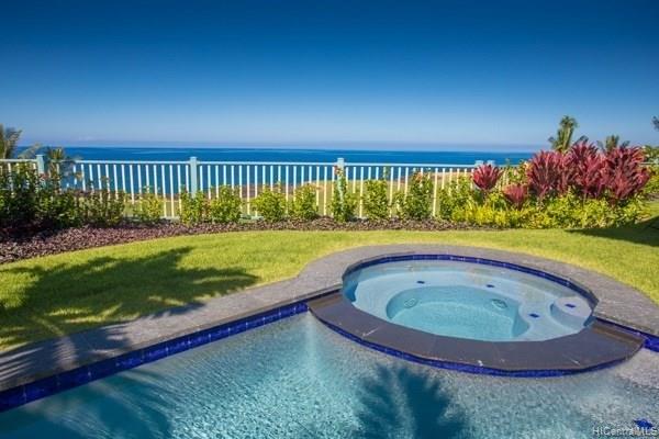 Newly constructed, 3 bedroom 2 bath home with a oceanfront setting on beautifully manicured fairway of Kona Country Club’s Ocean Course. Holua Kai is a gated subdivision located conveniently in Keauhou Kona, near the Keauhou shopping, yet has a private home setting with its own pool and spa.Enjoy charming mature landscaping which accents this single story home and brings the outdoors in from the oceanfront lanai and through pocket doors opening expansively to the great room.Splendid high vaulted ceilings, large lavish designer decorative fans throughout, or enjoy central air conditioning, dark hard wood floors that compliment the detailed cabinetry and trim in the vaulted ceilings. Open concept chefs kitchen complete with a rich sleek design, the dark cabinets. Vacation rentals allowed.