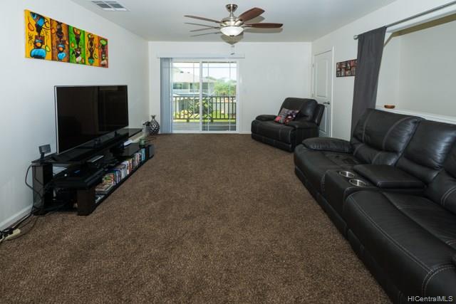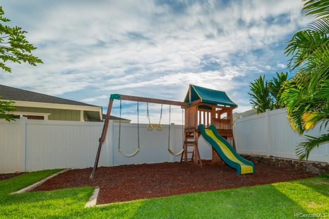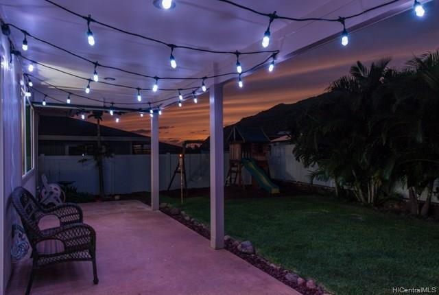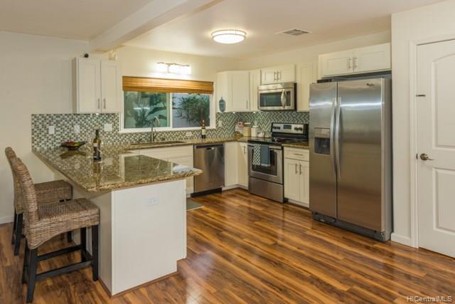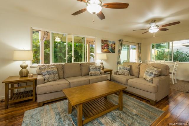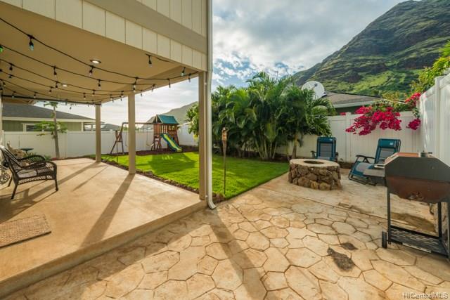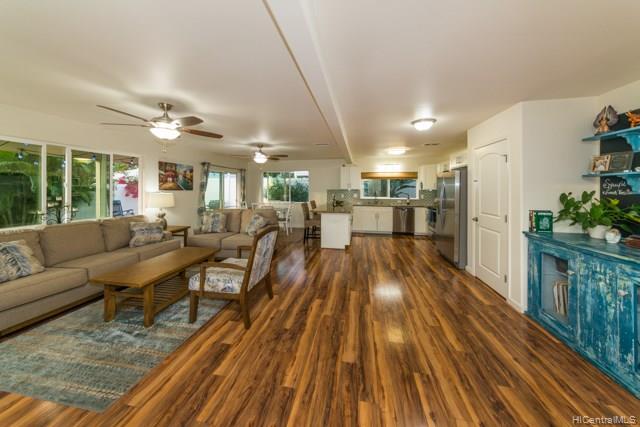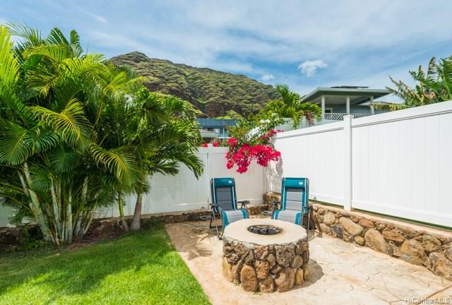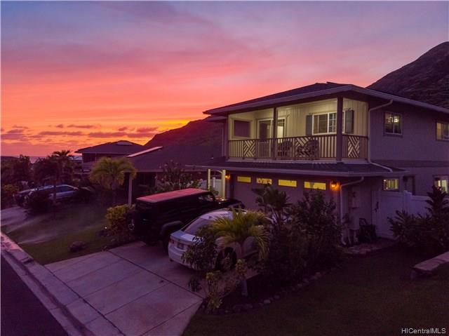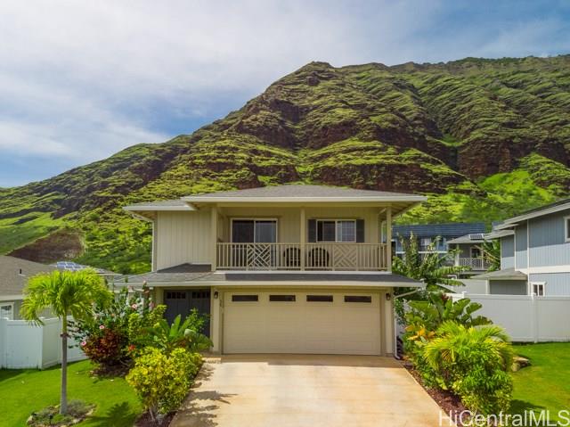 Hawaiian perfection! Sun, surf, sand, sunsets and stargazing! The Makaha secret is out and this superb home delivers all the natural splendor and all the modern appointments. Double-pane windows and Central AC keep you peacefully cool. Stainless Whirlpool appliances simply get the job done and look great doing it. Beautiful solid counters and cabinets throughout the home and wood laminate flooring all downstairs and in the upstairs halls. Generous upstairs living room can easily be converted into a 4th bdrm if desired. And a lava rock fireplace out back for cool winter nights. American Home Shield Combo Plan included! Seller will entertain a VA Loan Assumption for appropriate VA Buyer.