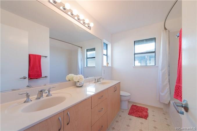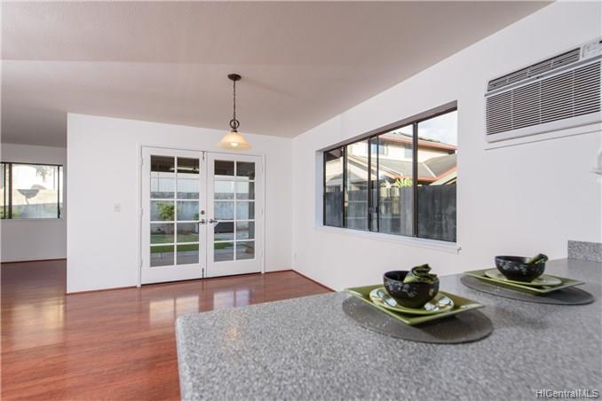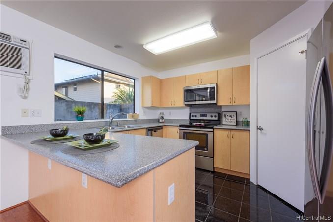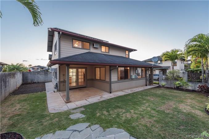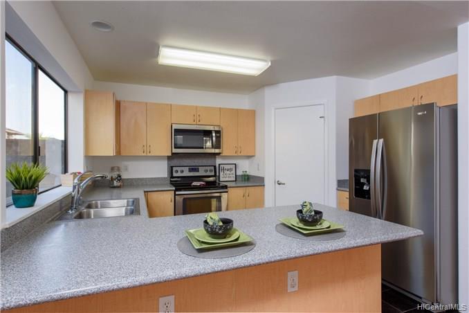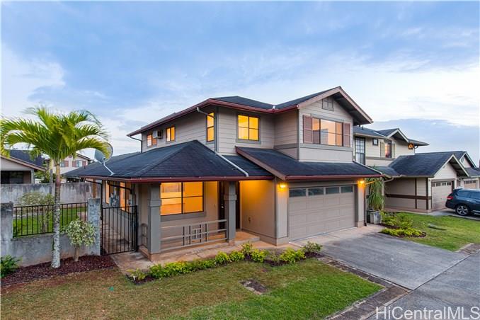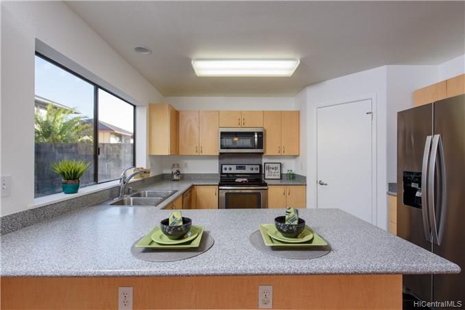 NEW PRICE!! This well-maintained GEM of a home in Mililani Mauka’s Destiny III, is located at the corner-end of a shared driveway creating a private, quiet and peaceful setting, with the main traffic being that of your neighbors. Move-in ready with brand new appliances (Refrigerator, Stove, Microwave and dishwasher) fresh paint, and new carpet. Step out to the back yard through french doors to entertain or enjoy family time. This location provides privacy from neighbors whether you are in or outside. PV panels keep the electricity bill low! (27 panels, Paid in full by seller).