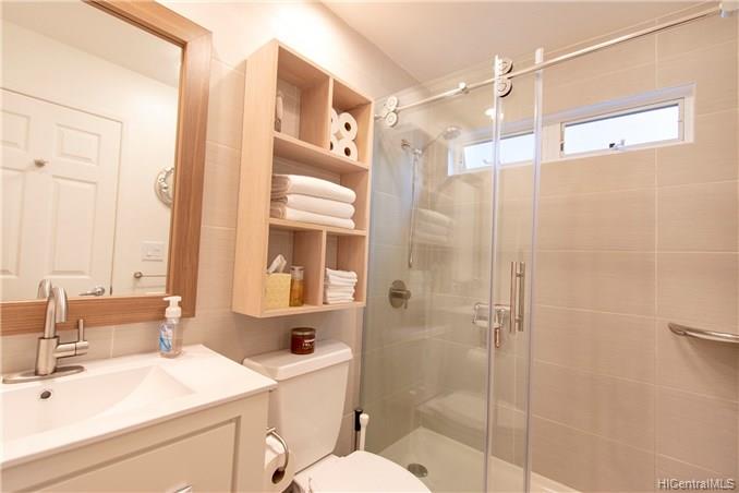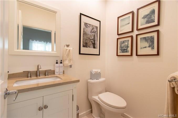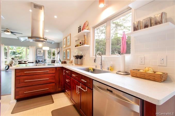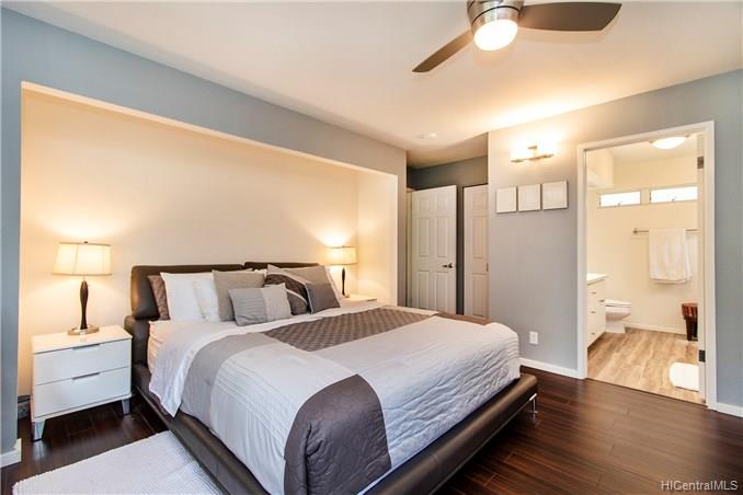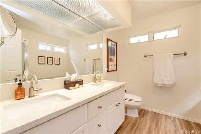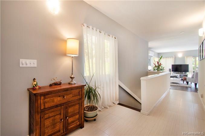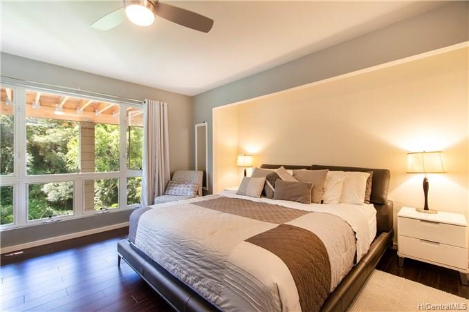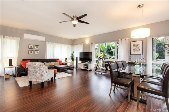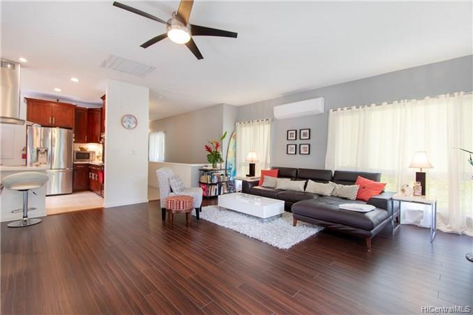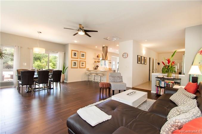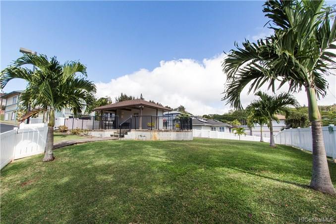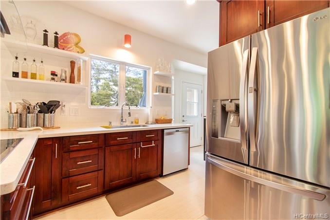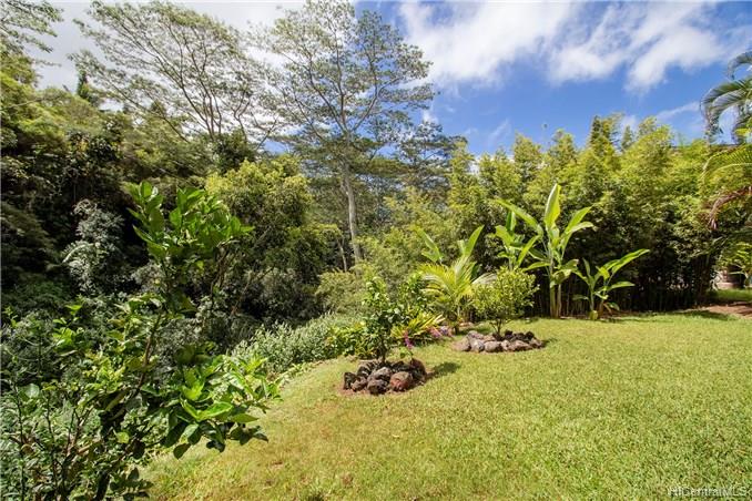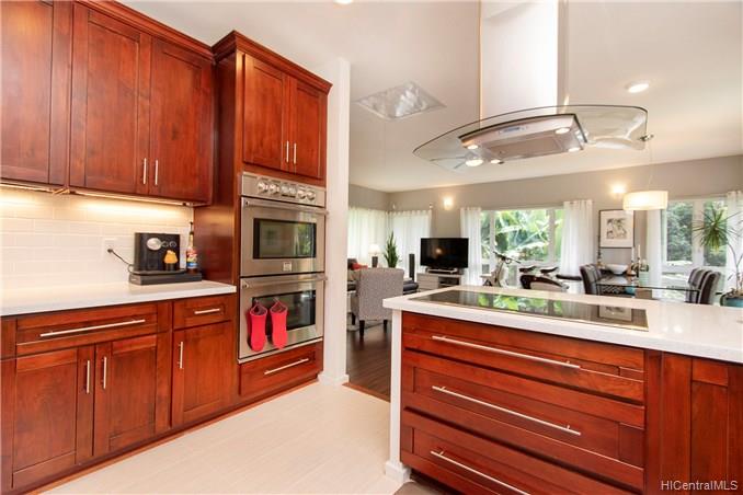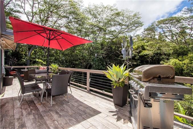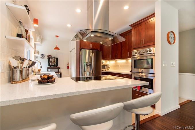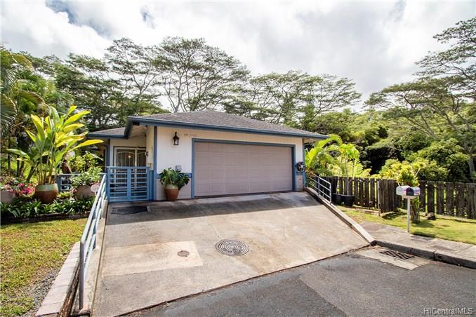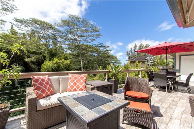 Private!! Located at end of cul-de-sac with spectacular oasis view of the forest and nature in the community of Lapa’olu in Aiea Heights. Beautifully fully renovated in 2013-2014. A chef’s kitchen that opens into the private deck and dining/living area, perfect for entertaining. Induction stove and stainless steel appliances, LED lights, split AC, solar water heater, quartz countertops, tiles and wooden floors, security alarm system, 2 car garage with large storage and 5 yr ground termite. Close to Pearlridge Shopping Center.