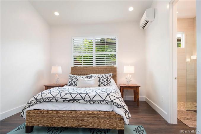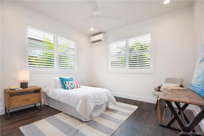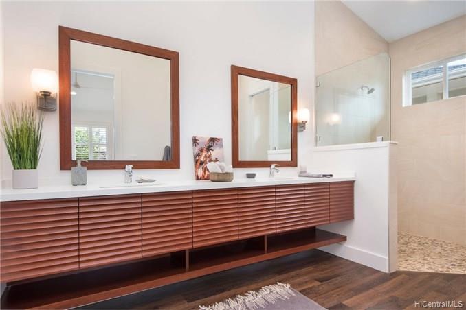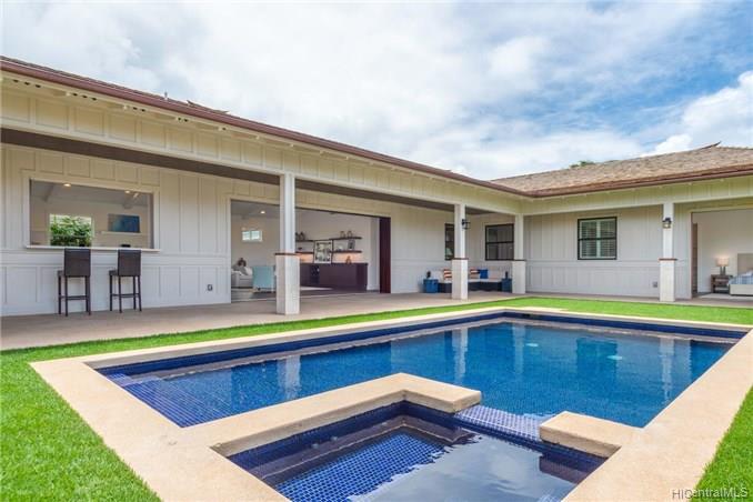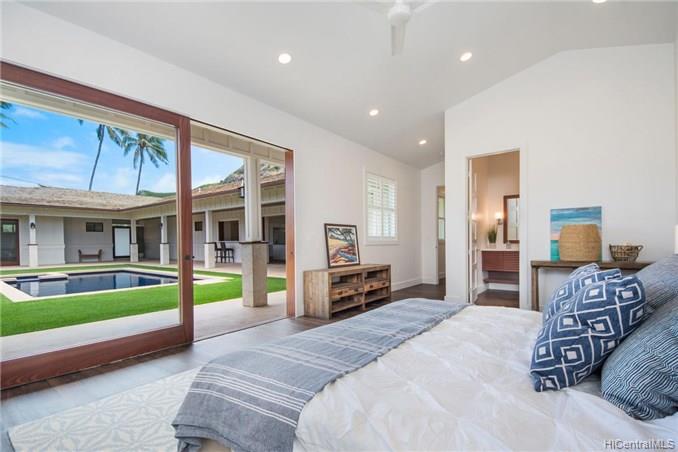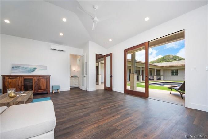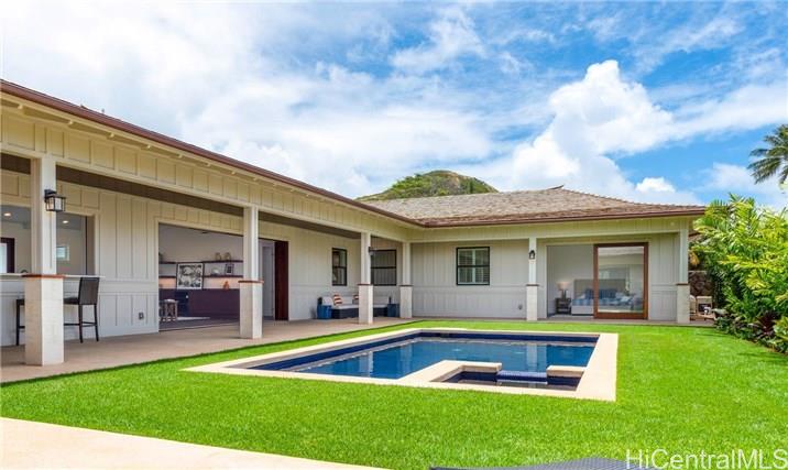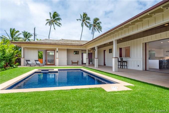 Privately gated custom home located on one of Lanikai’s best streets. An open floor plan, sense of space, and Hawaiian modern classic finishes define this newly built home. Large decks and lanais surround the central pool area and open to the vaulted main living and kitchen through 8′ African mahogany sliders. With too many details to list this 4 bedroom main home with a separate recreation room offers a discriminating buyer the option to live in one of the world’s most desired locations.