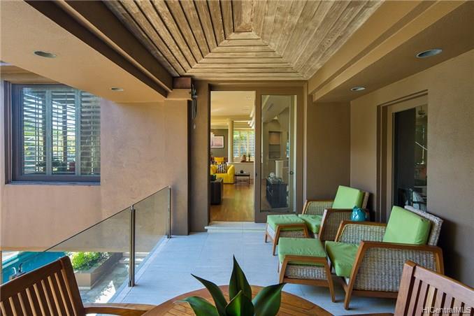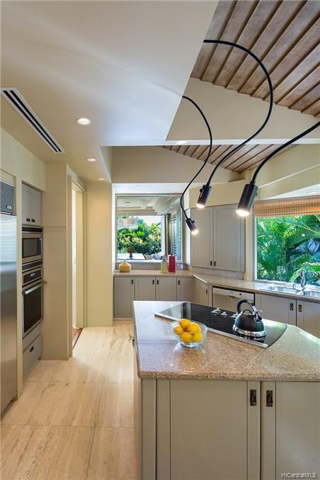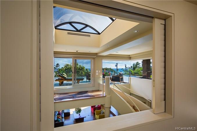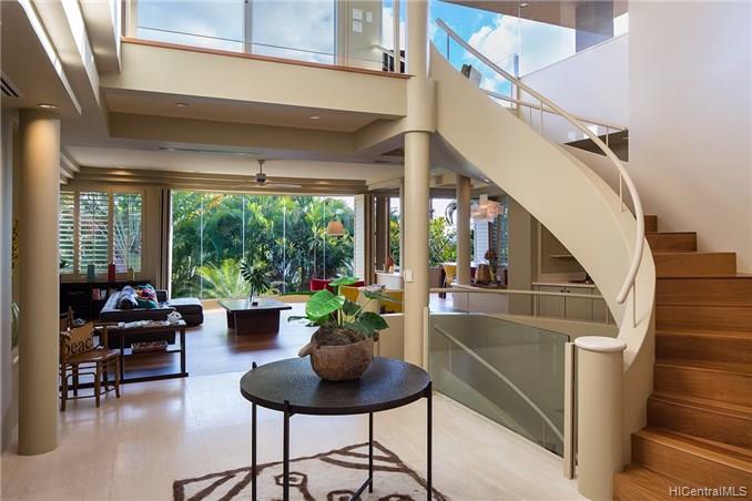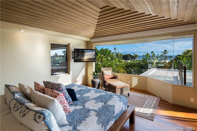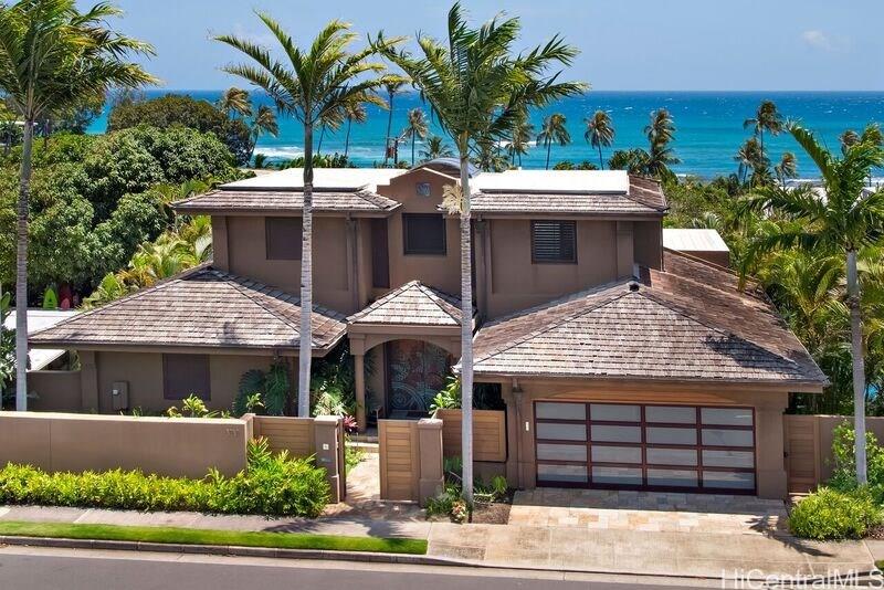Elegant Contemporary home with a beautiful architectural design & panoramic ocean view in a private tropical setting. Striking detail from floor to ceiling in every room. Main level features the living spaces, kitchen, office and a guest bedroom suite. The upper level boasts a Master Suite with private deck to capture the ocean views! The lower level is comprised of a Family Room, a second Master Suite and a large guest room, which open to the pool, covered lanai, and BBQ area. Sandy beach is just 2 blocks away!