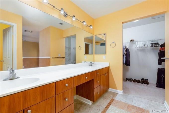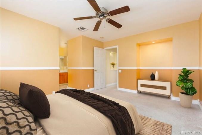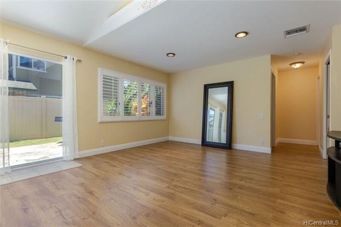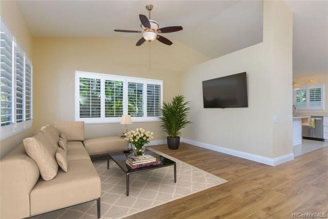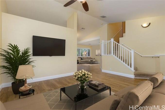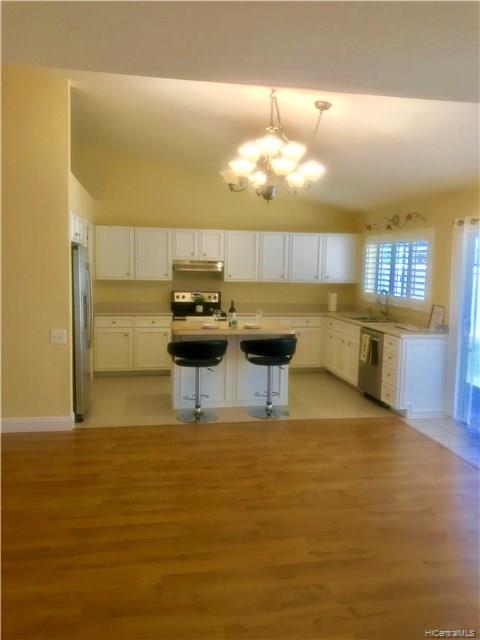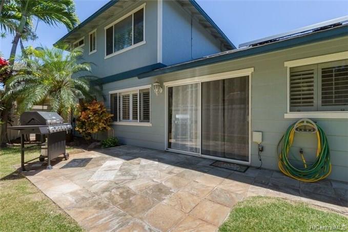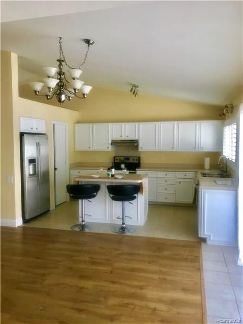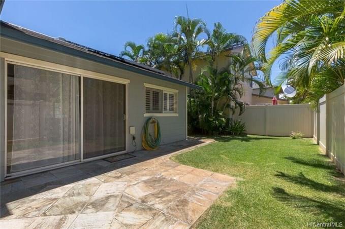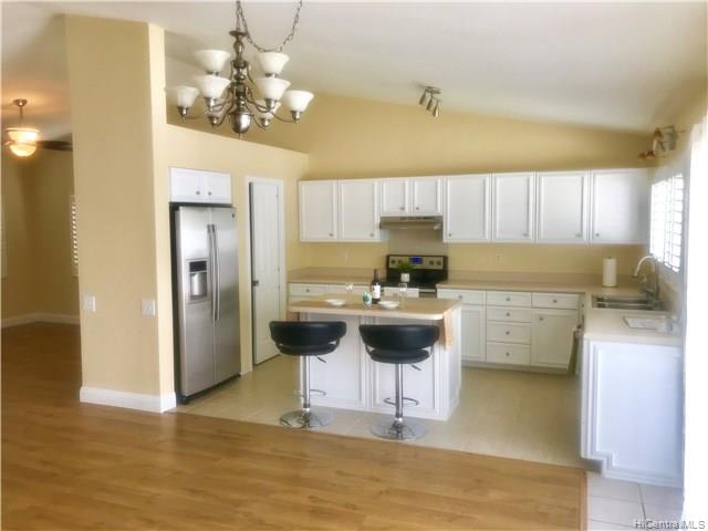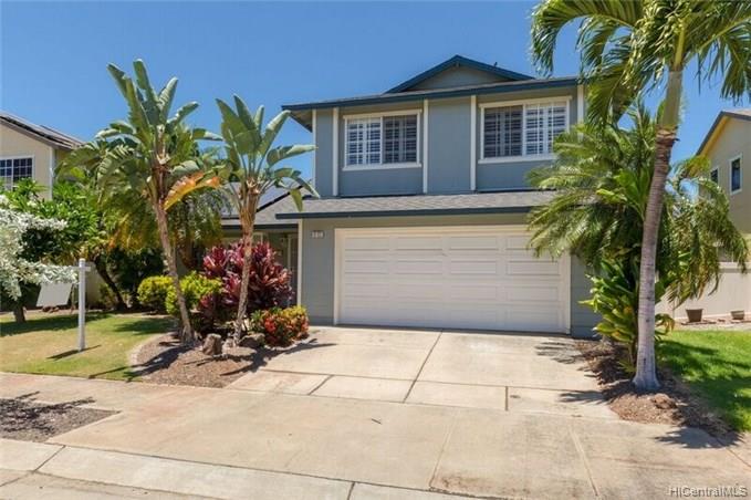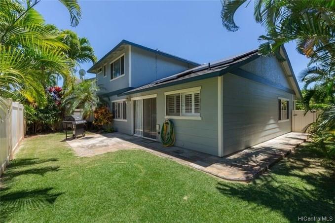 Single Family Home in Ewa by Gentry with low association fee of $38.00 and NO MAINTENANCE FEE. 4 bedrooms and 3 full baths. 2 car garage with additional parking for 2 vehicles on the driveway, plus street parking. Full bedroom and bath on the First Floor. Features are: 29 leased Solar Panel ($216.32 per month), spacious open layout downstairs, renovated in 2018 downstairs flooring and kitchen, sprinkler system. Fenced in back yard and walk your dog in nearby Hoaluana Park that encapsulates a big dog park and small dog park. Walking distance to children’s playground, schools and Laulani Shopping Center which includes Starbucks, Buffalo Wild Wings, Safeway, and a Pharmacy, etc… Run the AC with the solar panel system. Check it out and start moving!