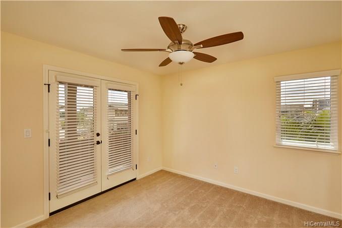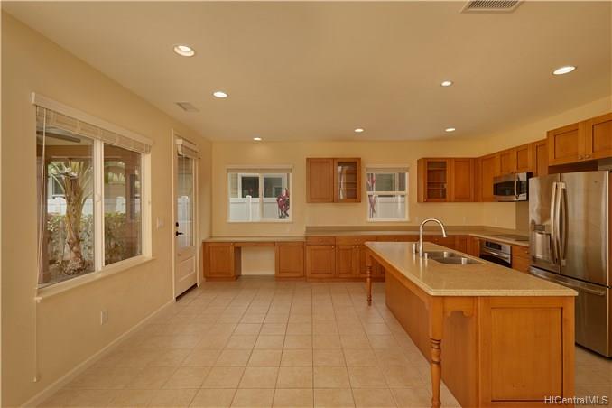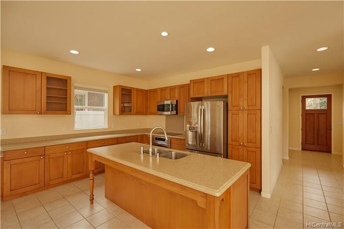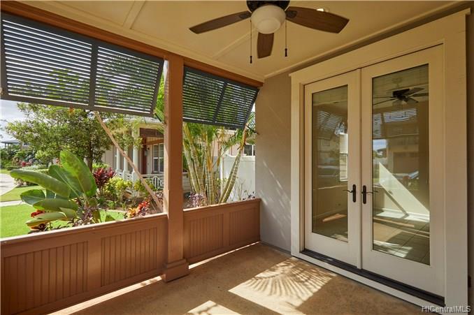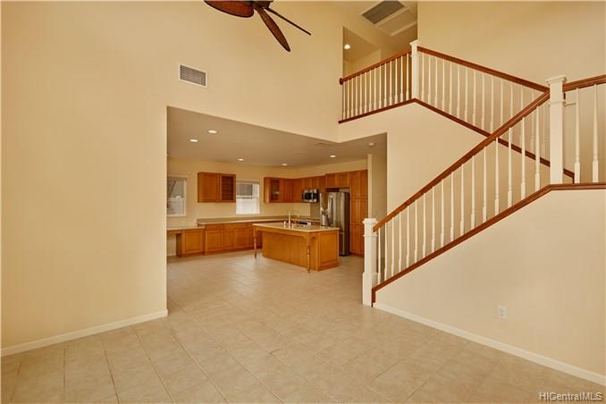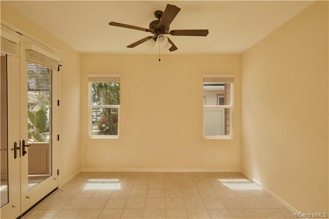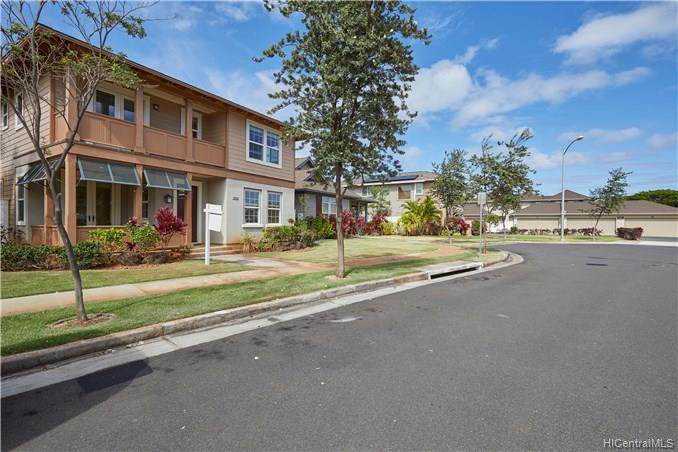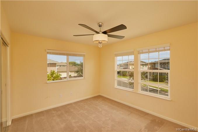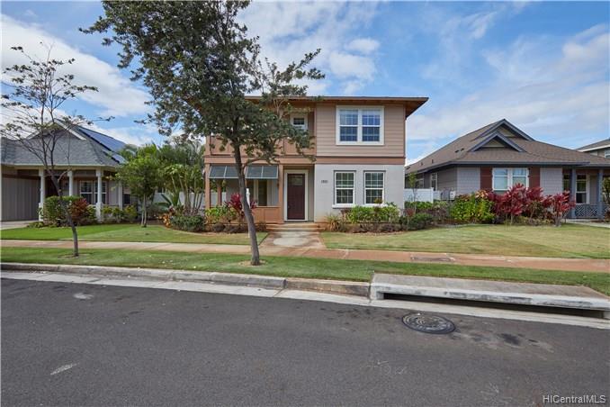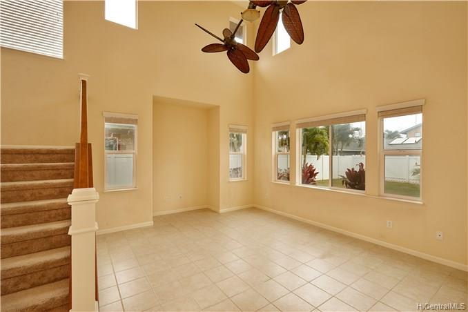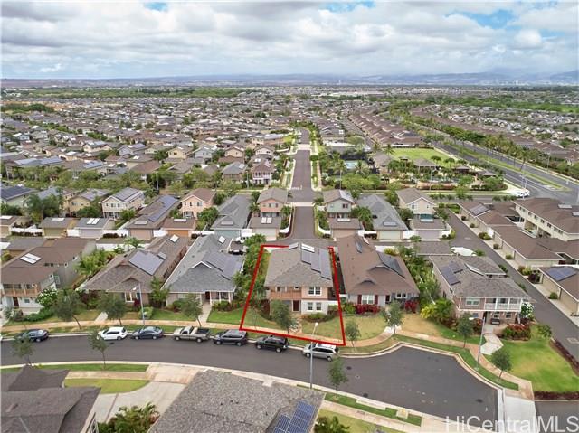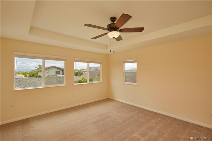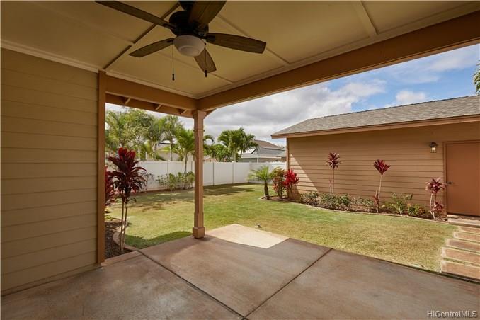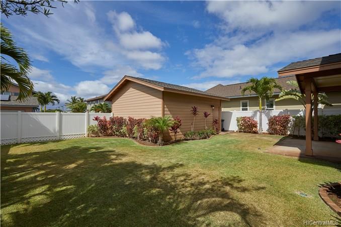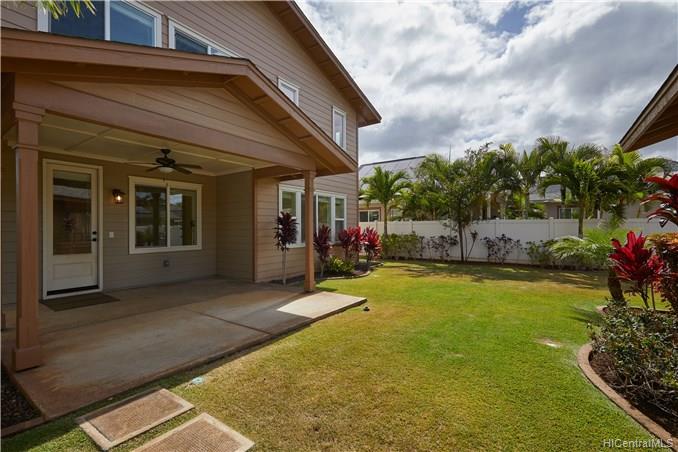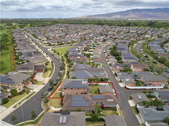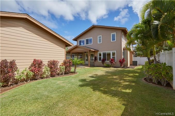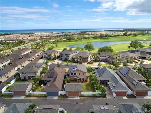 Excellent condition, single family home with a large yard and with 26 OWNED PV panels under the original Net Energy Metering program with Hawaiian Electric Company that also has a bedroom and full bathroom on the first floor a formal dining room and room for an extra parking slab. Located at the end of Kaiokia St near the 9th green of Hoakalei Country Club. This model 40.20 home in Ka Makana at Hoakalei is located near the community swimming pool and fitness center. Featuring central AC, stainless steel appliances, dark kitchen cabinets, tile flooring downstairs, high vaulted ceiling in living area, large covered lanai in backyard with lush green landscaping and manicured green grass.