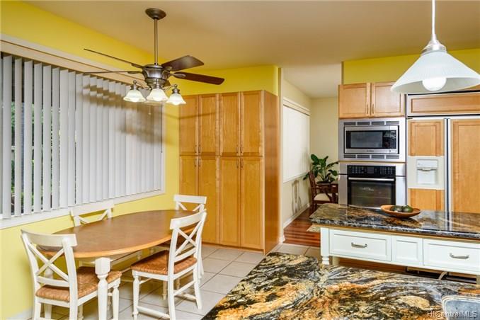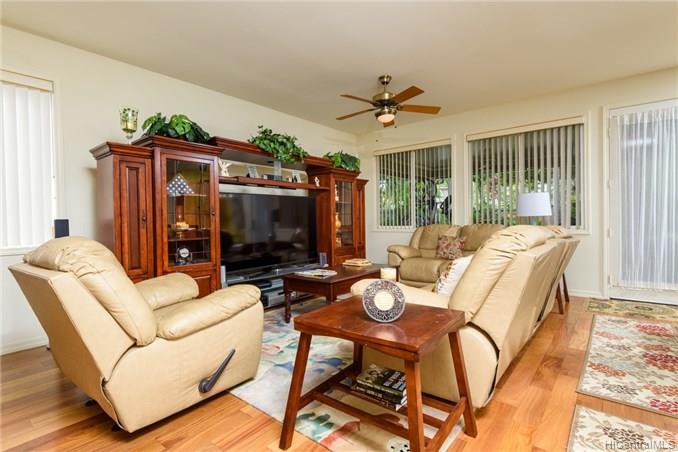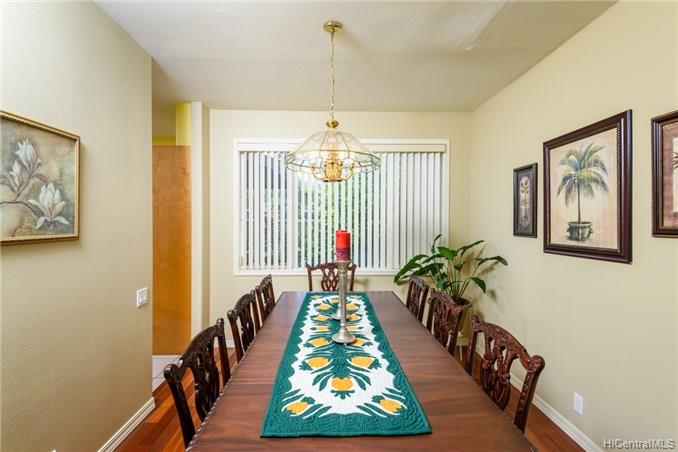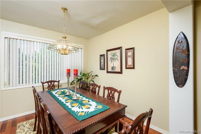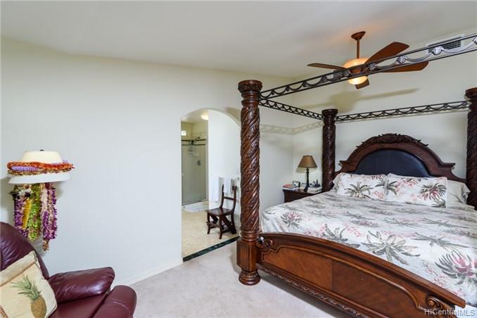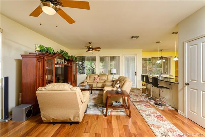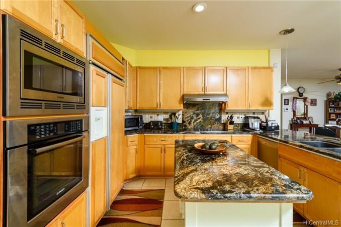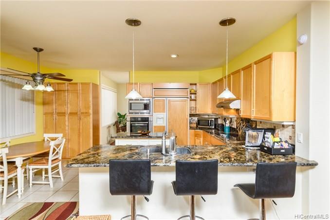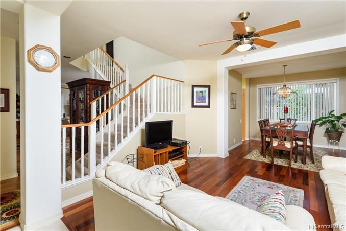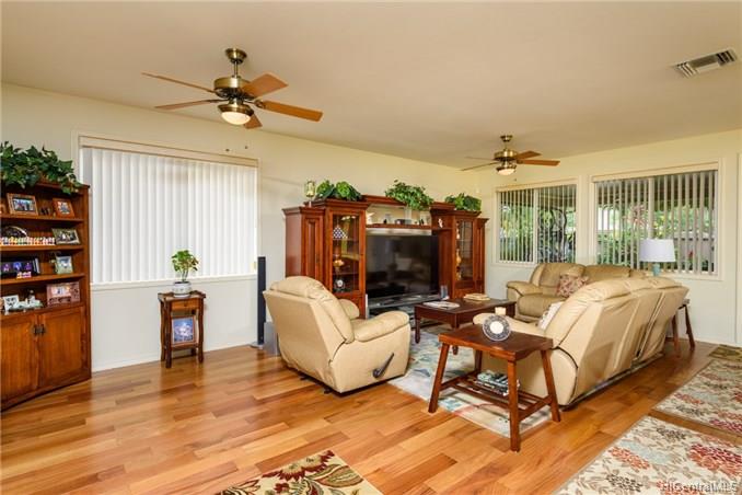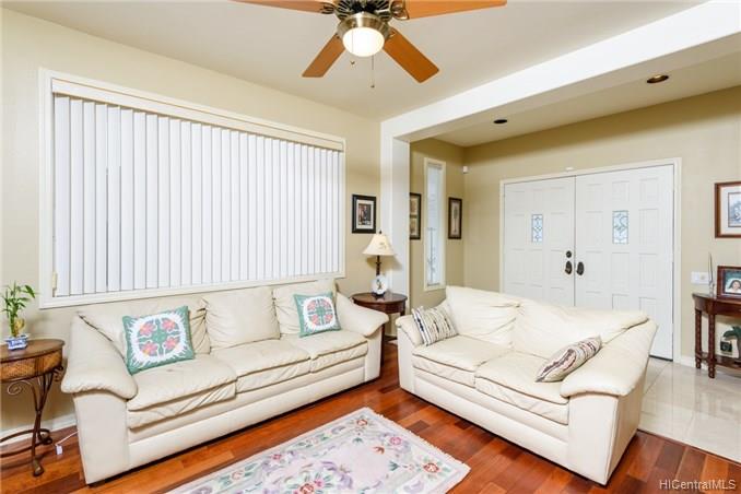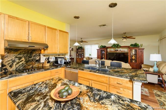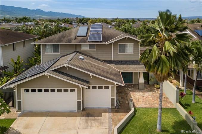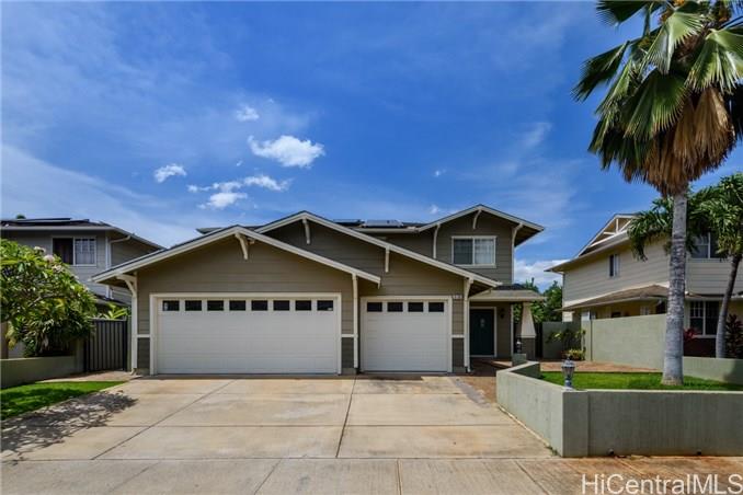 Gorgeous 4 bedroom 3 bath home located in the desired Carriages subdivision. This beautiful home features Engineered hardwood floors in the living room and dining room, Central AC, granite kitchen counter tops, Bosch 30” convection oven, LG energy efficient washer/dryer, Jen-Air Range, GE Monogram refrigerator, Bosch microwave, Bosch dishwasher, alert alarm system, solar water heater and 15 panel owned PV system. Exterior of home painted in 2010 and Seller’s VA loan assumable at 3.25%. Residents can access the Ewa Gentry community pool, party room & park.