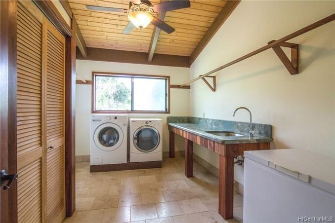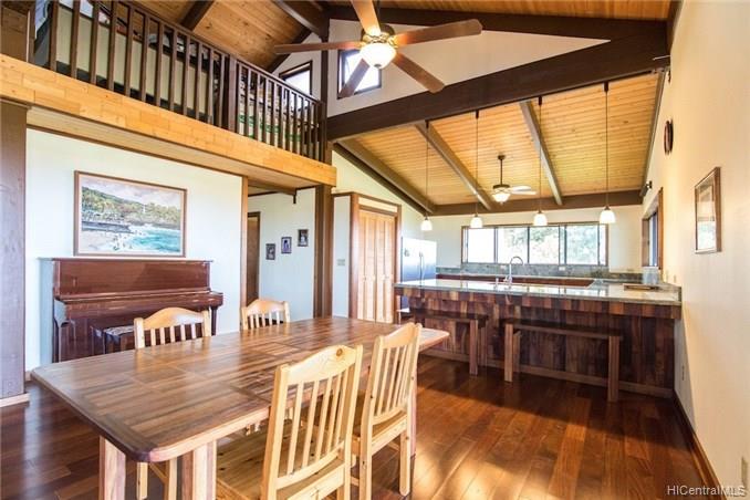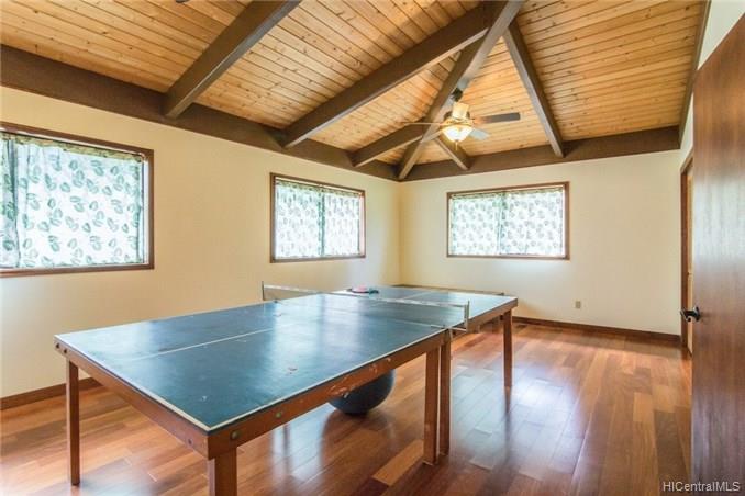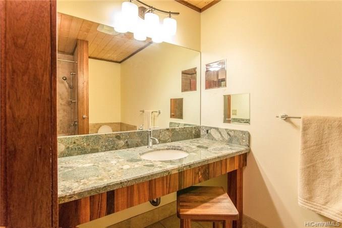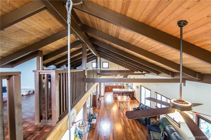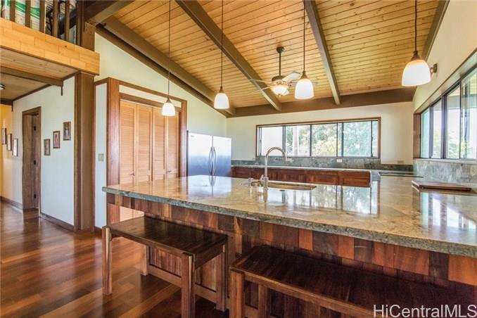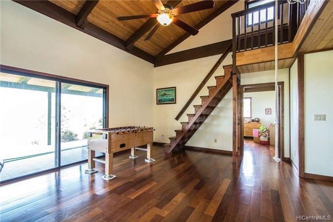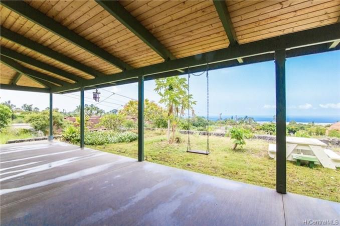 Spacious home features: 4 bedrooms plus bonus room 3 full bathrooms with granite & Koa counters, oversized doors, wood trimmed bath with beautiful tile Large closet near kitchen currently used as an office Laundry room is well organized with hanging bars, shelving and granite counter top Over sized Detached garage equipped with a 1/2 bath and beautiful wood lined ceiling Loft that overlooks the living area perfect for an office or storage 1036 sf covered lanai Front yard was dug for a pool but then filled in with fine dirt for gardening. To add a pool would not take much work in digging. Beautiful Rock Walls terrace two additional flat area’s fronting the home for future additions, roadway in between to drive between pads
