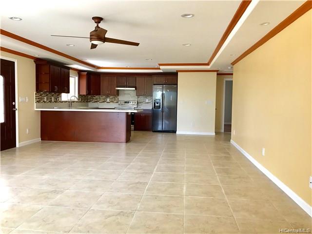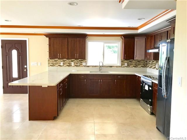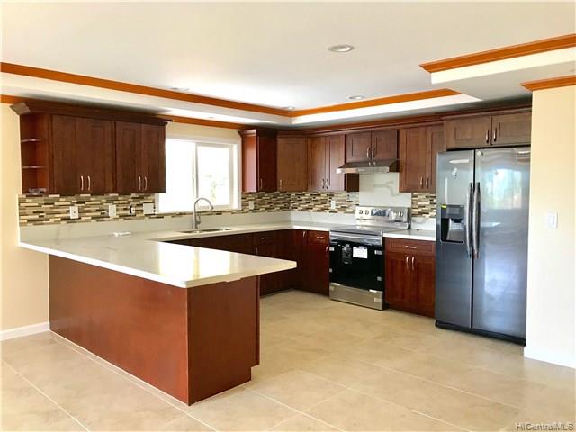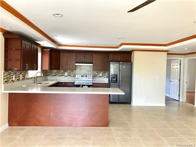 PRICE REDUCED! Brand new single level home in a great newer neighborhood! Enjoy cool breezes this this custom built Makakilo 4 bedroom 2 bath home. Come check out this beautifully constructed home with open floor plan, large gourmet kitchen, quartz countertop, mosaic glass backsplash, spacious living room, crown moldings, hard wood floor, and more. Located just minutes away from Disney’s Aulani Resort and Ko’Olina Resorts. No maintenance fee or association fee. House sits on a level land. Backyard is terraced with staircase. Great for gardening!