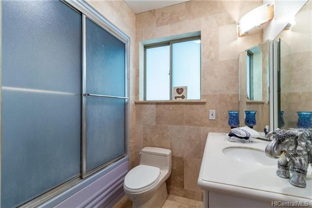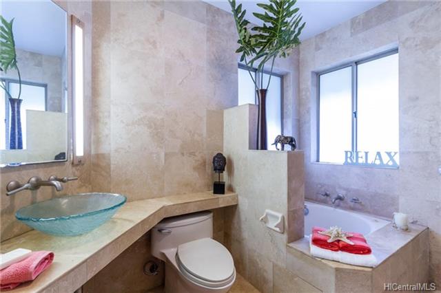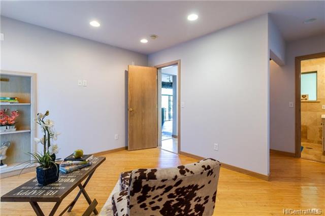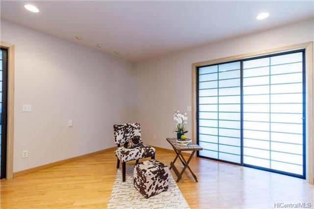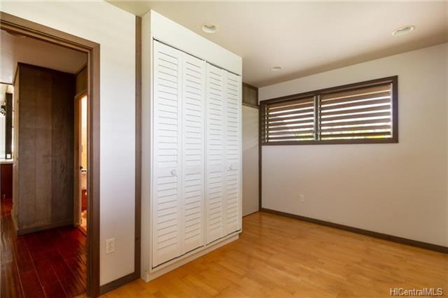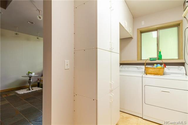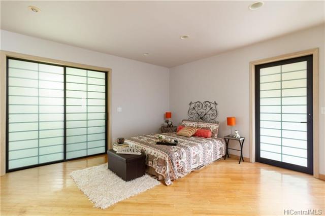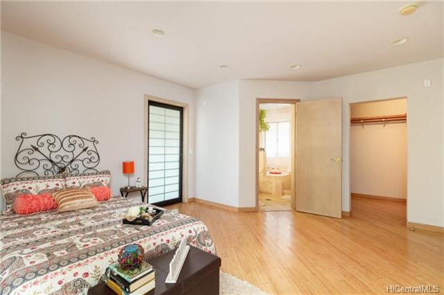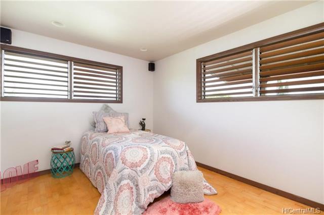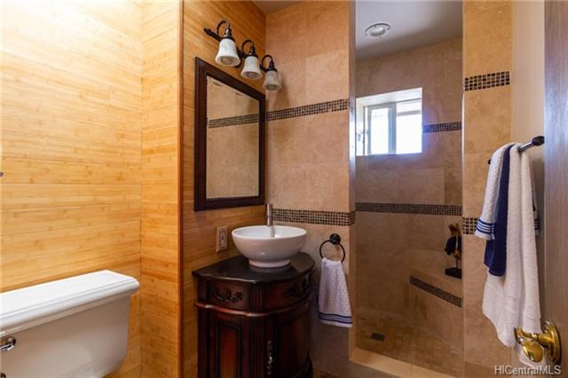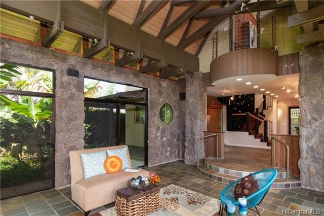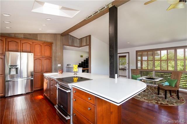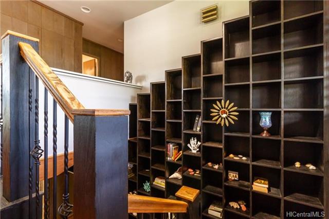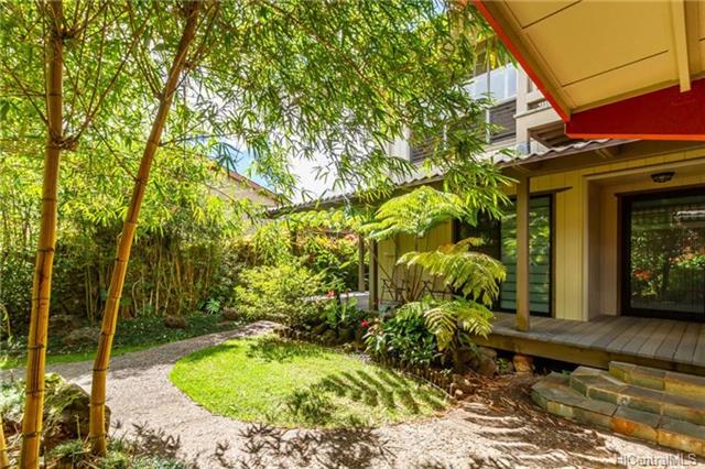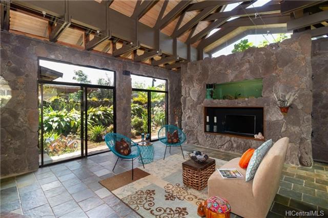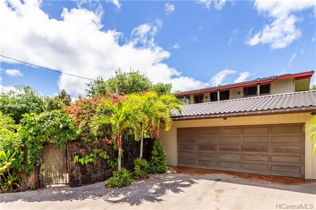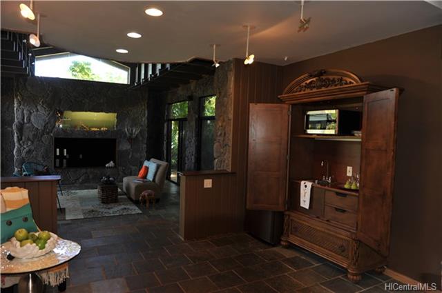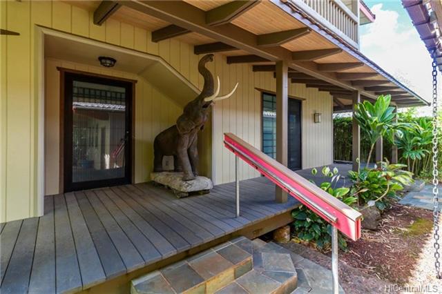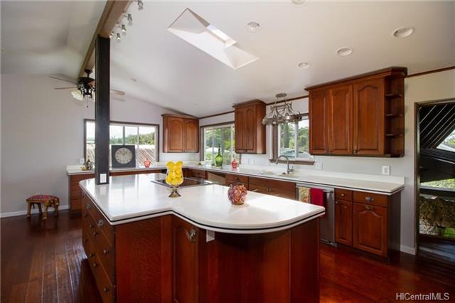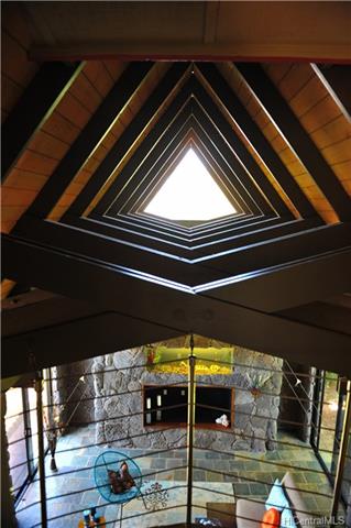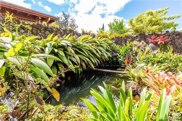 Architectural Gem 2,106 sq ft living area, 1,000 sq ft covered deck, and 694 sq ft detached garage on 7,500 sq ft enclosed fully landscaped property in Wahiawa Heights. Views from entire upstairs, 4 bed 3-1/2 bath with very large island kitchen with modern appliances, laundrey room, stealth wet bar, grand stairway with bookcases, moss rock great room with 22′ high open beam ceiling and 7′ overhangs. Solar hot water with 120 gallon storage, 3000 gallon koi pond with waterfall, 500 gallon built in wall aquarium, fully wired for alarm, surveillance, and speakers in every room. Detached garage with shelving wired for a workshop with 4 ea 220 volt outlet sand 12 ea 110 volt counter height outlets, and built in air compressor. Exposed aggregate meandering walkways, Japanese joinery covered deck with original Trex decking. Modern commercial grade sliding glass doors with Shoji look. Met-tile roofing. Built to last 100 years.