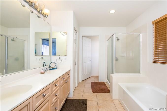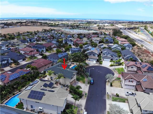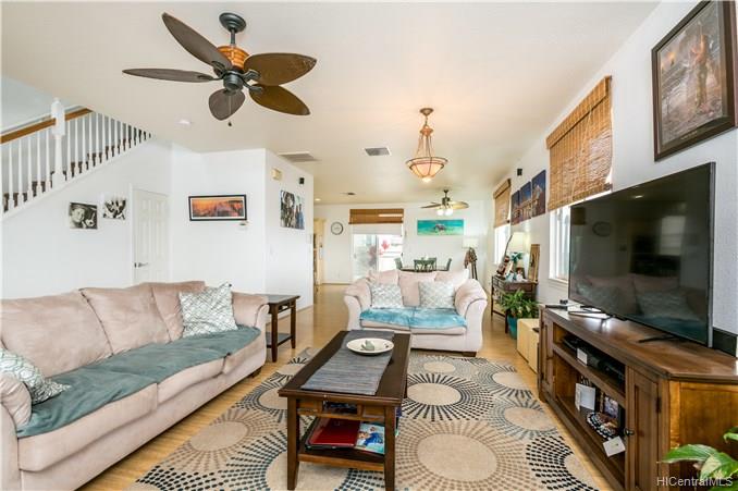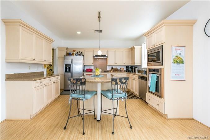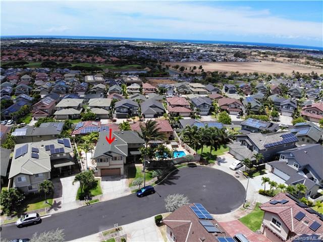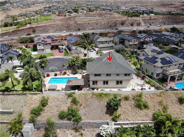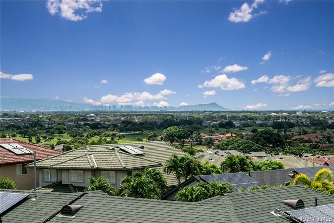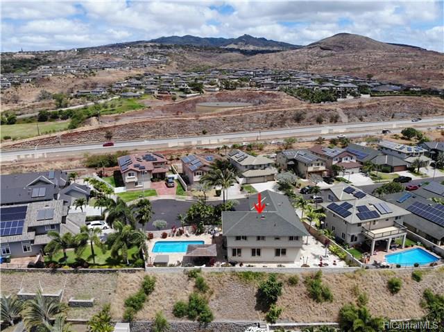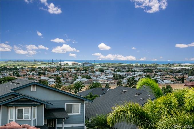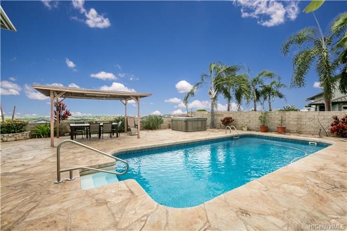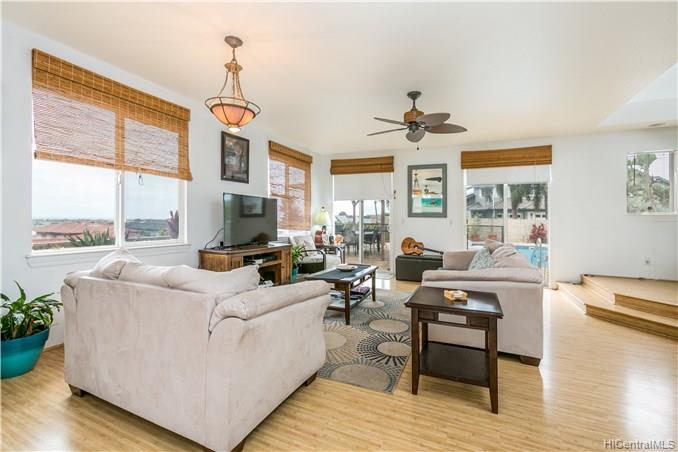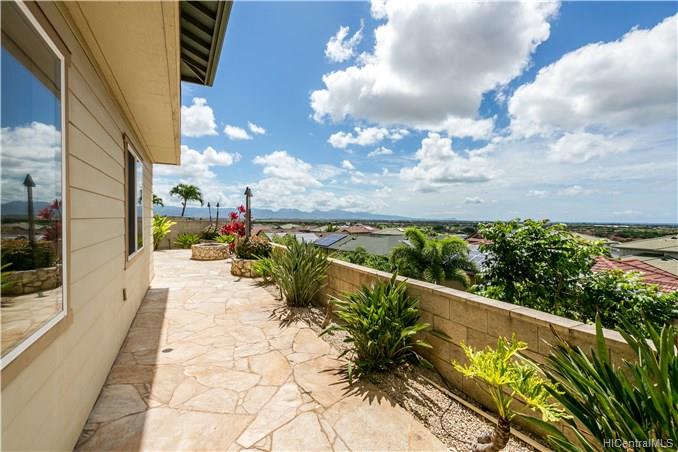 Rare opportunity to own an elegant & spacious home located at the top of Kapolei Knolls. This two story 4 bdrm 2.5 bath features panoramic views to Diamond Head & the Pacific Ocean. Spacious open floor plan flows into the large kitchen with granite counter tops, center island & stainless steel appliances. Upstairs presents a large additional living space, generous sized bedrooms & large bath. Huge Master Bedroom suite w/ separate shower and tub, dual sinks & walk-in closet. Central AC. Large outside entertaining area covered with slate stone, gazebo, swimming pool, Jacuzzi, gas fire pit & tiki torches. Low maintenance landscaping and care free automated sprinkler system. Conveniently located to shopping, restaurants, UH West. Sold in “as-is” condition.