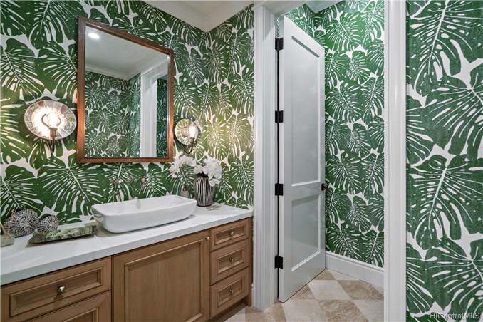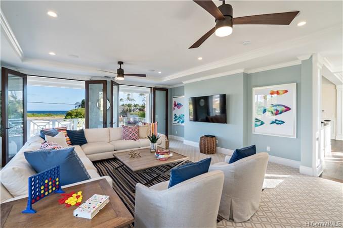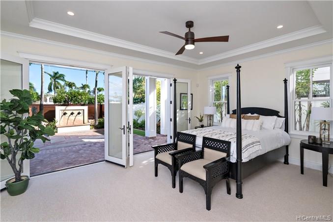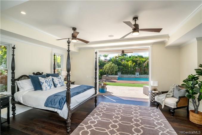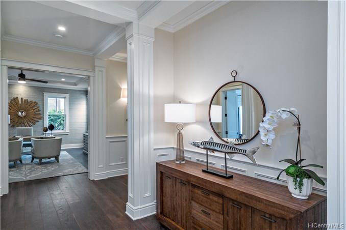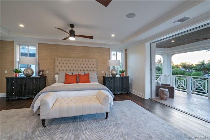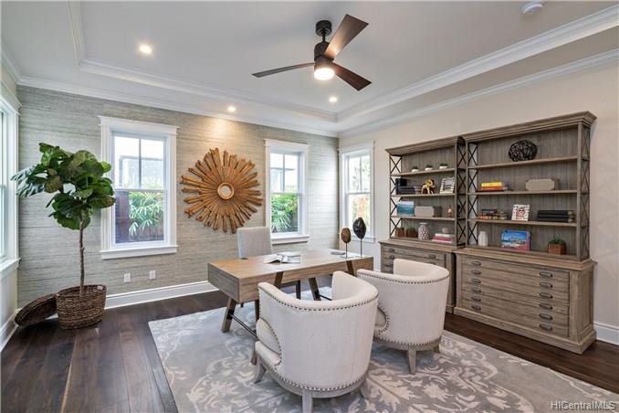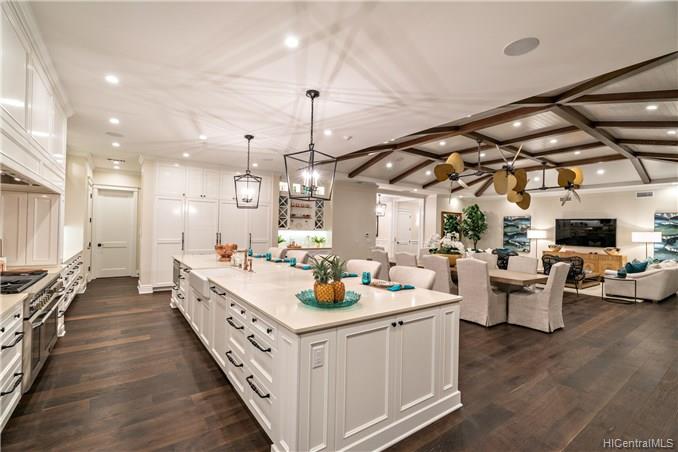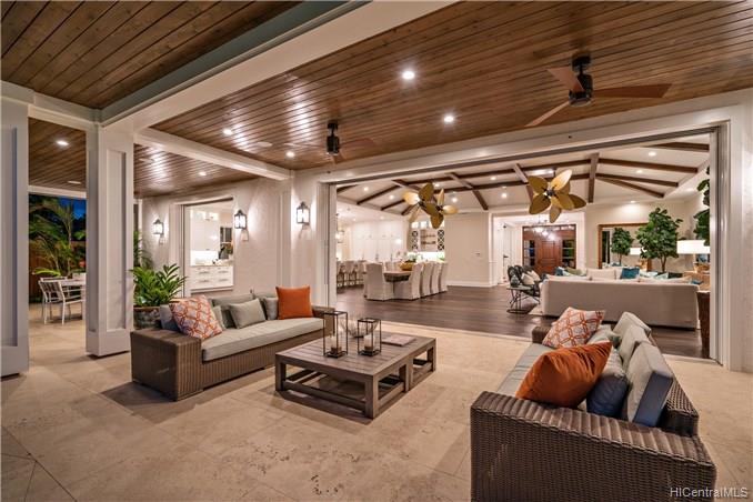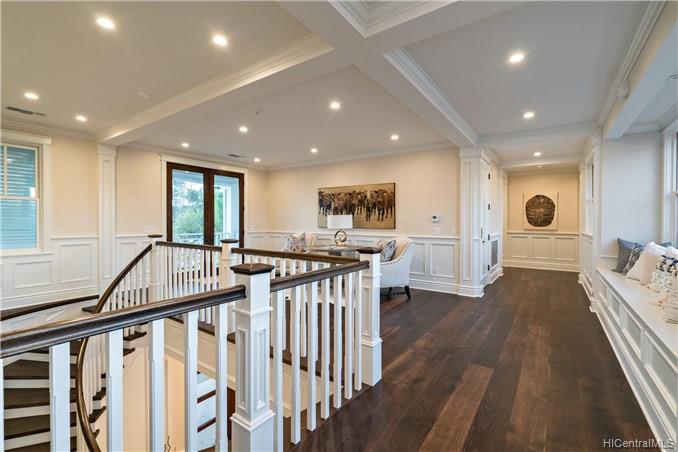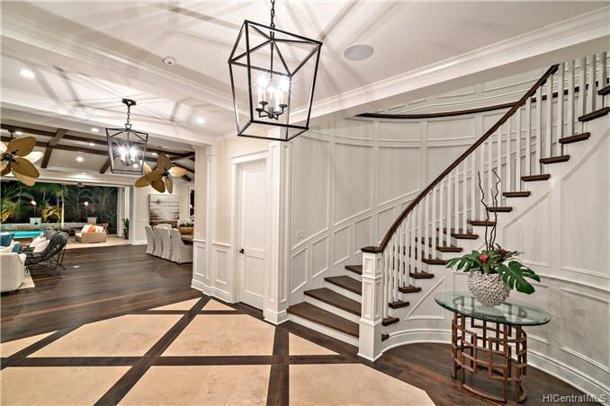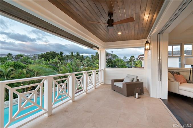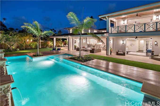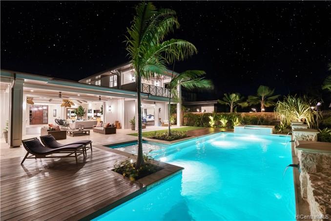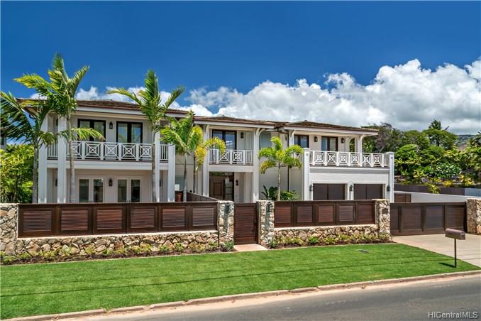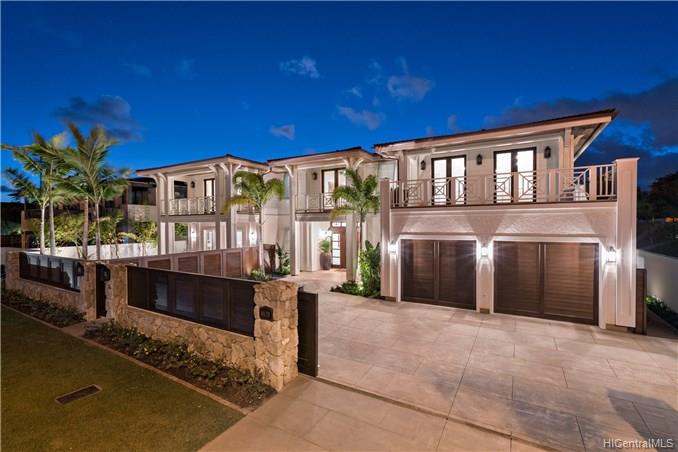 The unique combination of the West Indies and 2017 Modern architecture of this beautiful residence fits perfectly into the Kahala Avenue location of this brand new Nicholson designed home. A magnificent entry with a beautiful curved staircase provides a fitting introduction to this amazing home. High ceilings, classic detailed molding, grand spacious main rooms which lead to generous covered lanai and deck areas, lap pool and spa with lush landscaping and, with this larger lot, there is even grassy areas for children or pets. Floor plan includes two generous downstairs bedroom suites, one with its own private courtyard with fountain, a large office and powder room. Upstairs three bedrooms suites, two with lanais and an a huge family/media room can be reached by the staircase or elevator.