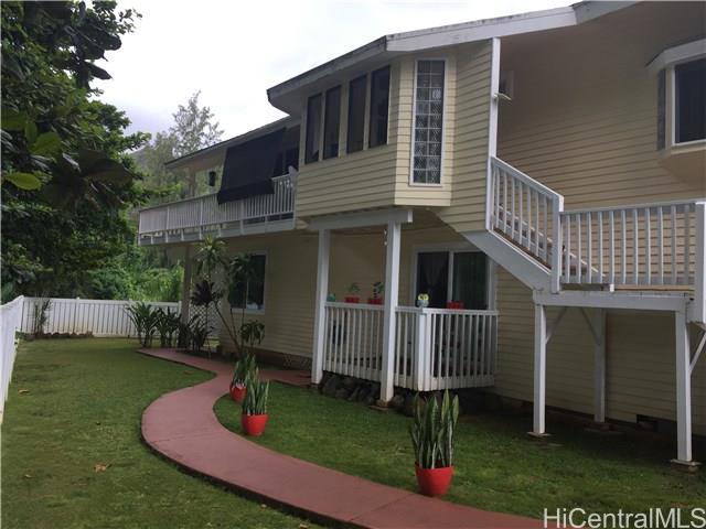 Beautiful 5 bedroom, 3 bath home nestled in a lush tropical setting. Breathtaking views of the Koolaus w/ white sandy beaches directly across Kamehameha Hwy. This home features 3 bedrooms, & 2 full baths upstairs.. + 2 bedrooms, 1 full bath, and a 2nd ‘full kitchen’ downstairs. The upper level lanai wraps around the entire top floor. The entire yard is fenced / enclosed…great for all pets. Separate entrances on both levels, w/ a large 3 car covered garage. An ideal property for large families, a vacation home, or as a rental investment. Close to everything.. Longs, Foodland, Napa, McDonalds, Gas, Banks, Post Office, all on same street. To be sold in ‘AS IS’ condition. Number of rooms may not match tax records.