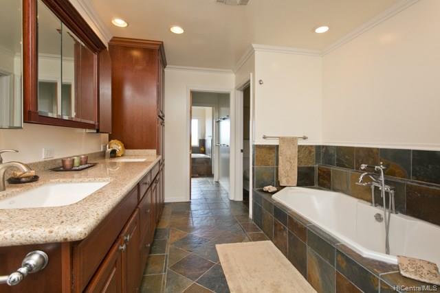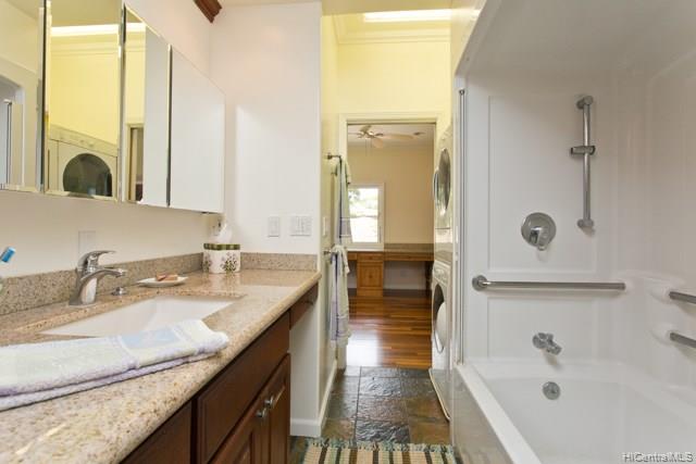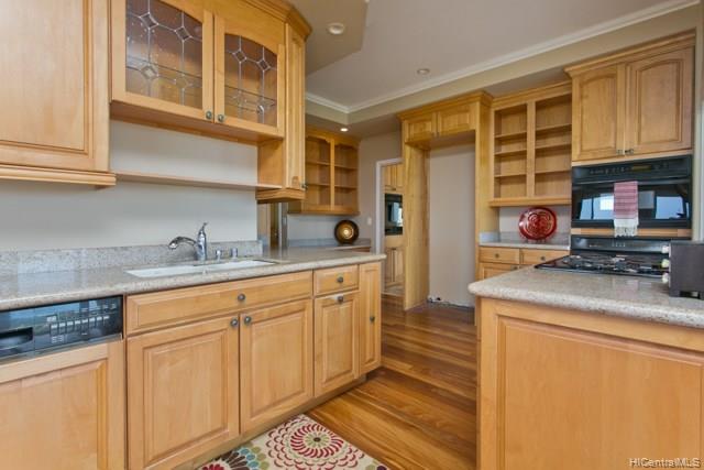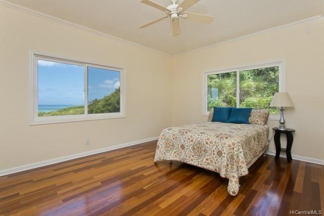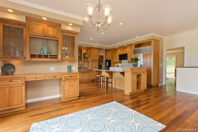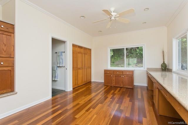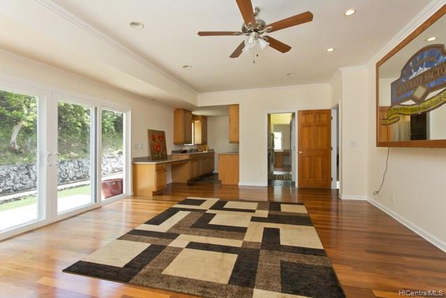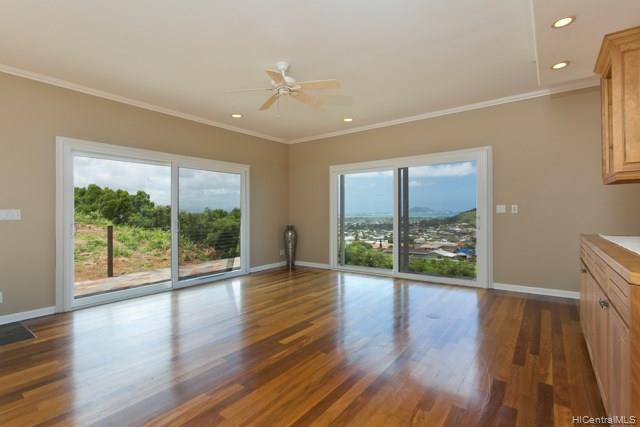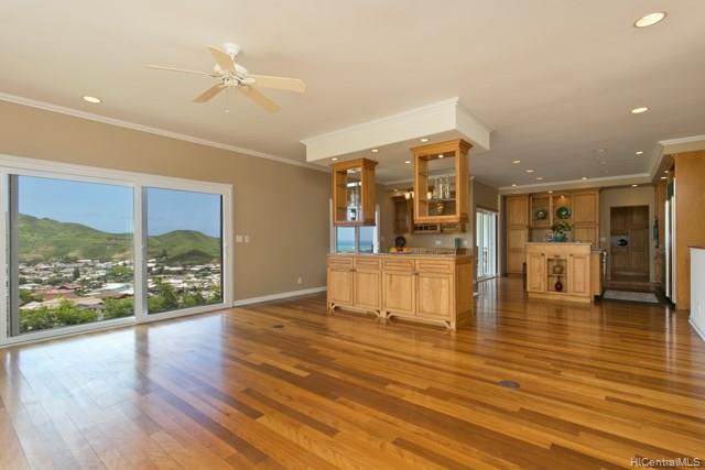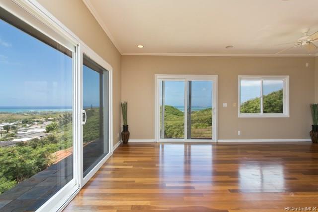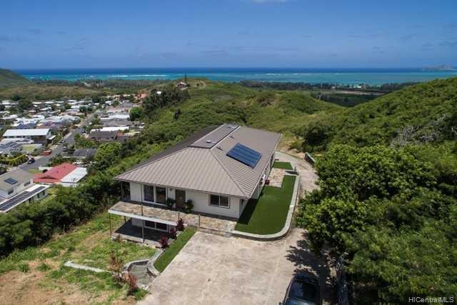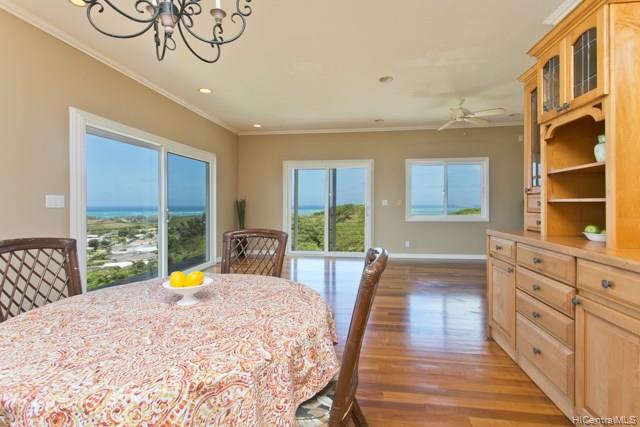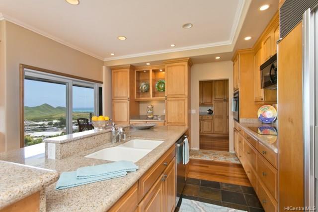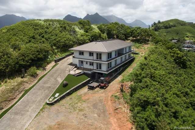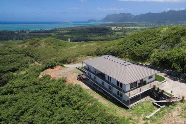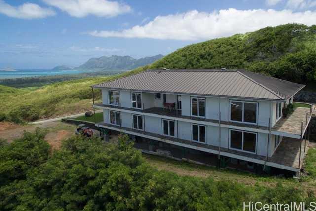 Fabulous coastal, ocean & mountain views from the very top of Keolu Hills. You can see from Kaneohe Bay to Bellows and Rabbit Island. 5000 sq ft home built in 2000 on 3 acres. Flexible floor plan can accommodate multi generational living. Upstairs: 2 living area, 1 bedroom suite, 1 studio suite, 1 office. Downstairs: 2 bedroom suites, 2 bedrooms & a hall bath, family room, 2 large utility rooms. Hardwood & slate floors, crown molding. Pocket doors thru out to easily divide space. Gated driveway. Private and quiet. Level areas to create lawns, gardens, ponds. View points for gazebos. Opportunity to create and estate. Open Sunday Aug 5th 2:00-5:00.