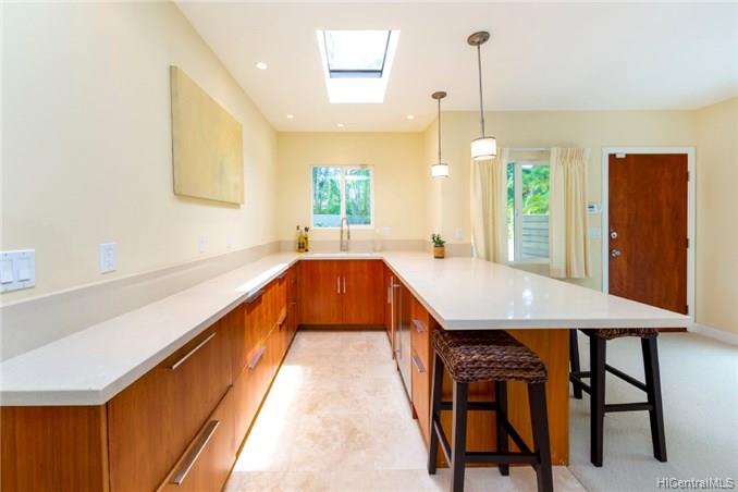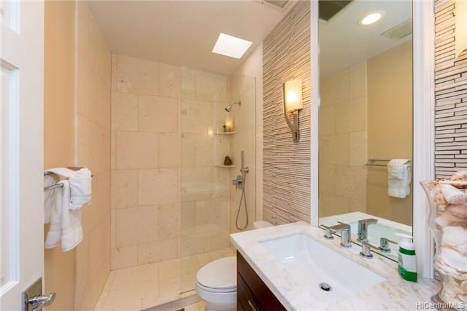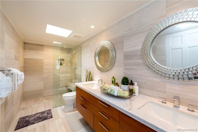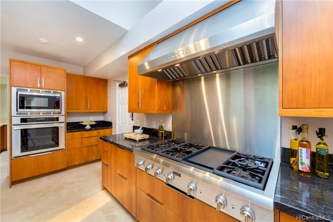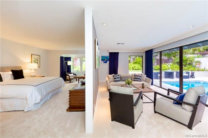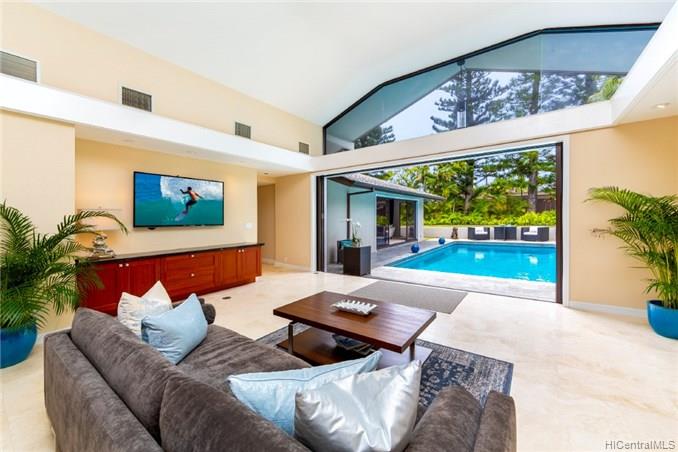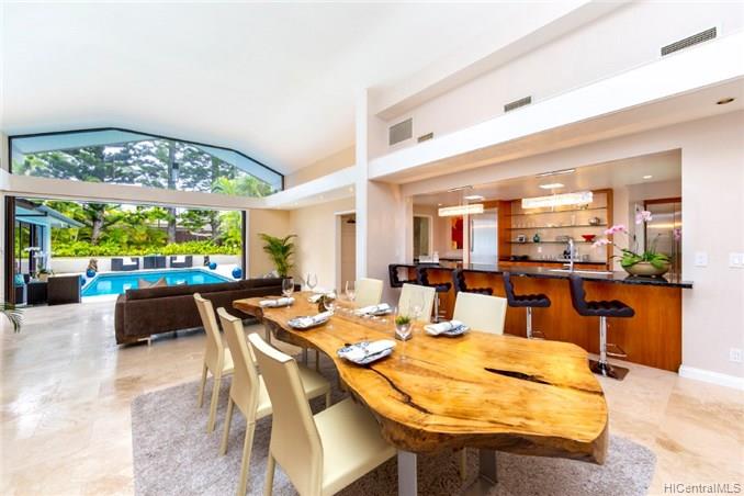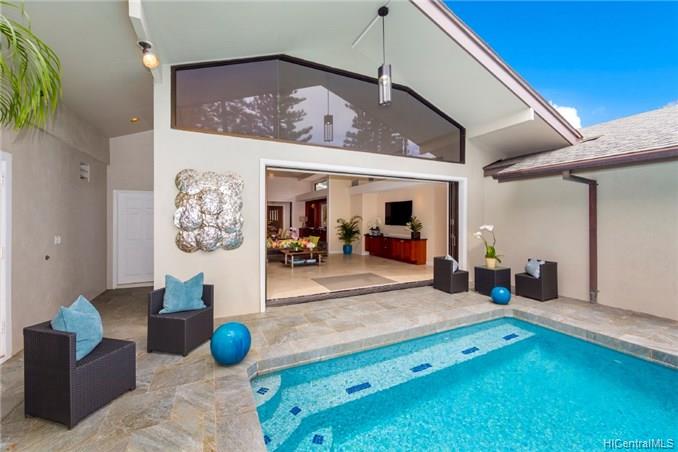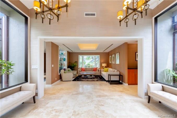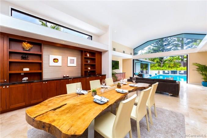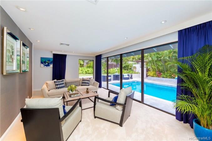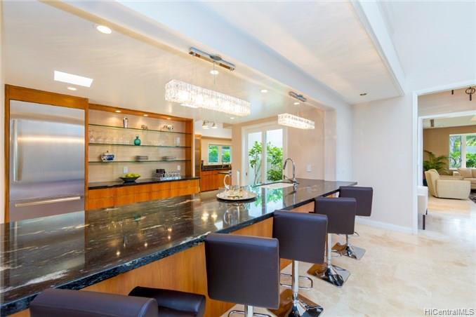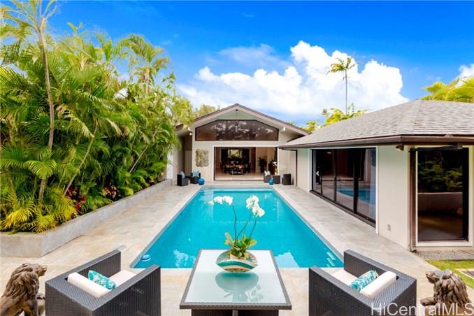 Captivating contemporary island luxury living on highly desired Aukai Avenue, a block from Kahala’s renowned sandy beaches. This masterfully modernized tropical retreat features a 5 bed, 5 bath main home with a separate 1 bed, 1 bath + kitchenette guest suite. Step inside & marvel at the open living spaces; a full wet bar off the gourmet kitchen services formal & informal living rooms, dining area, media area, all with easy access to pool & outdoor entertainment spaces via pocket doors. A spacious en-suite master includes a separate sitting room facing the pool. Finely constructed & furnished using Brazilian granite, large tile Travertine, Thermador appliances, Quoizel & James Moder chandeliers & more, this is uncompromising Kahala luxury, defined.
