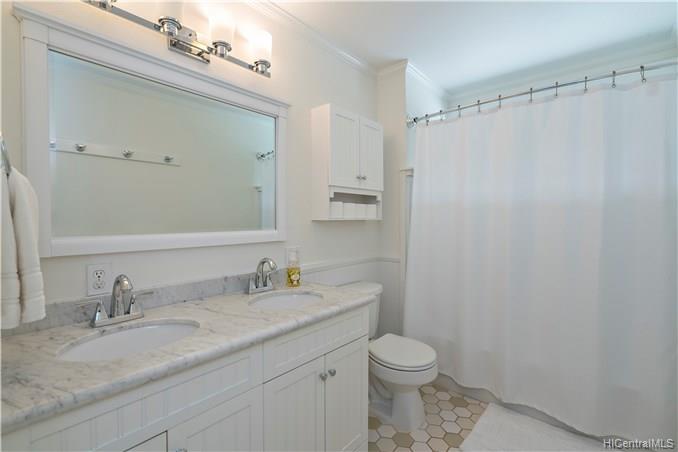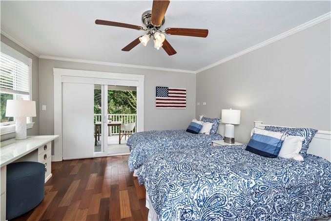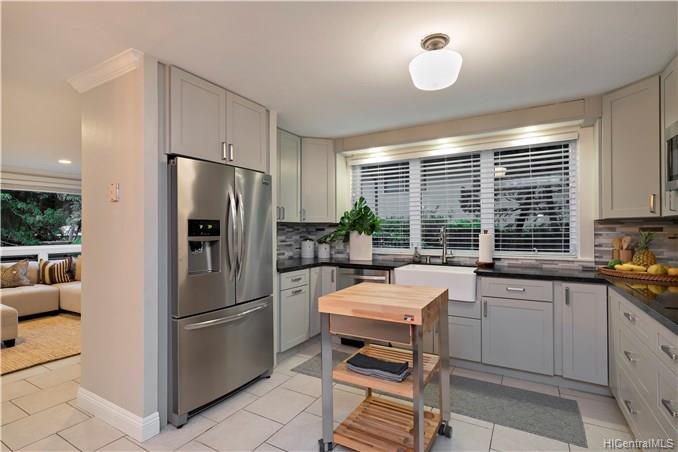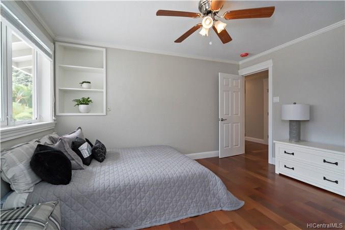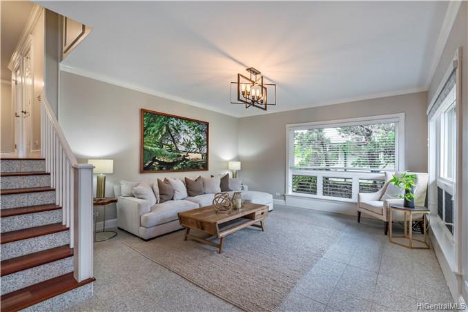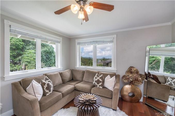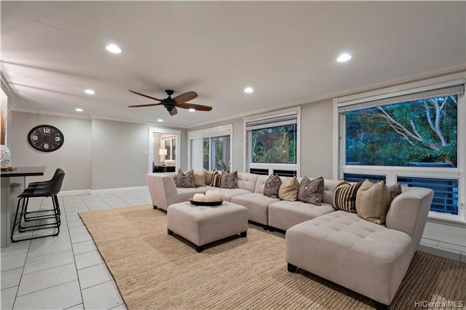 This executive home in Maunawili Estates has a 4 bed / 3 bath main house with a spacious 2 bed / 1 bath cottage built above the garage and an attached studio / 1 bath built below the garage. Both the 2 bed cottage and studio have separate entries. The house is ideal for multi-generational living or generating rental income. The residence is one of the best built in Maunawili with concrete walls and a solid roof. Upgrades include newly remodeled kitchen and bathrooms, hardwood and stone floors, and a large quartz covered lanai perfect for entertaining. The large level yard is lush featuring tropical landscaping with a freshwater stream running behind the property. The quiet, private property includes an in-ground pool and is near hiking trails. Only ten minutes to Kailua and Kaneohe.