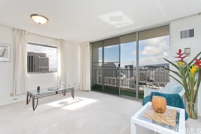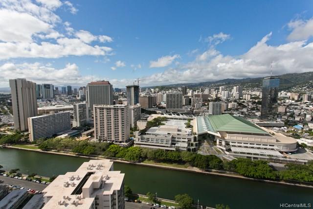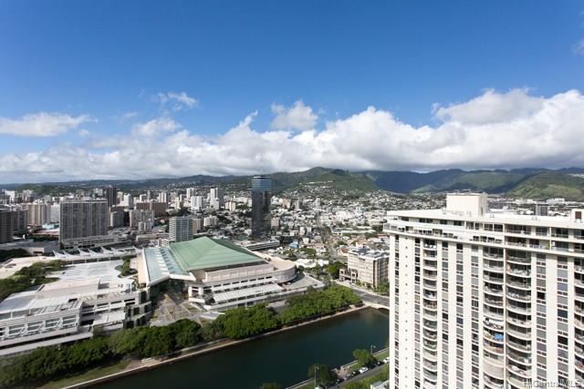 Beautiful high floor unit with ocean, mountain and sunset views. Very cheerful, spacious 1 bedroom with extra windows and a useable lanai over looking the Ala Wai. Wonderful amenities (pool, barbeque and views, views views on the top floor deck. Pets allowed, check with management. Attentive management in this well kept building. Ask me about some of the special features of the building.