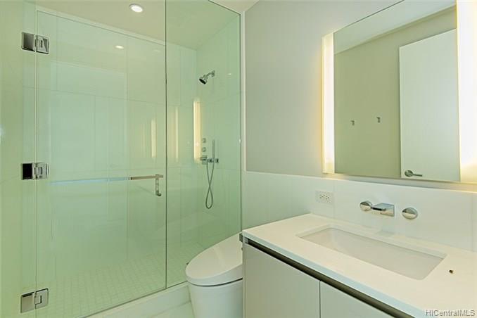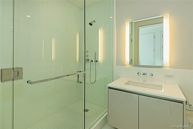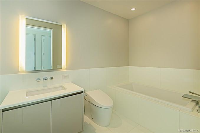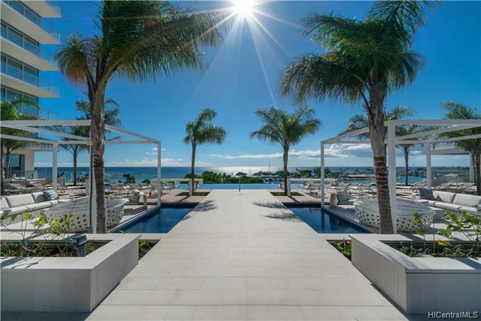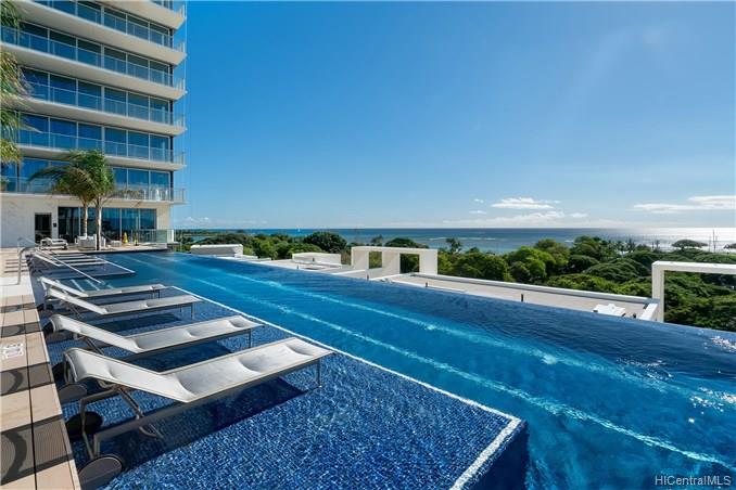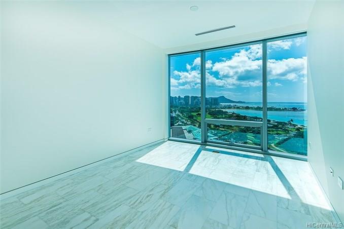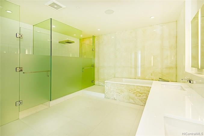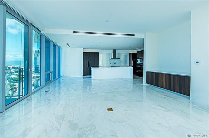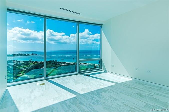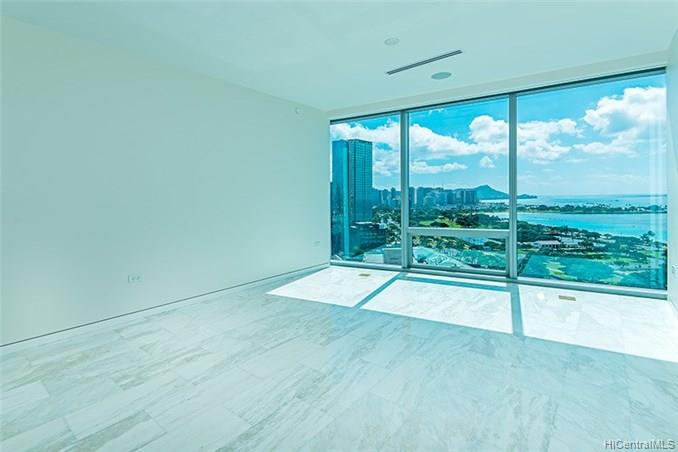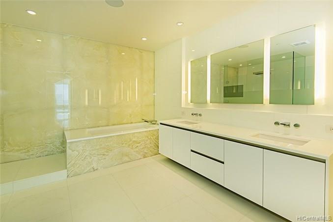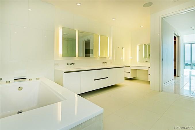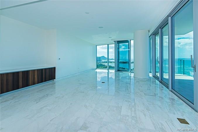 The luxurious flagship building in the heart of vibrant Kakaako with close proximity to Waikiki. This is a special three bedroom, three and one-half bath oceanfront/Diamond Head corner unit. Kitchen: Ashanti white marble flooring, fabric glass backsplash, blizzard white quartz countertops, artic white lacquer island cabinets, and smoked oak wall cabinets. Master bath: snow onyx feature wall with artic white lacquer vanity and built-in bathtub with stone face, mirror TV, 10-ft high ceilings, double-glazed, Low-E coated glass, motorized window shades, total of seven speakers for audio upgrades too. Abundant world-class amenities include guests suites, fitness center with yoga room, steam sauna, golf simulator, infinity edge ocean view pool, hot tub, and children’s play area.