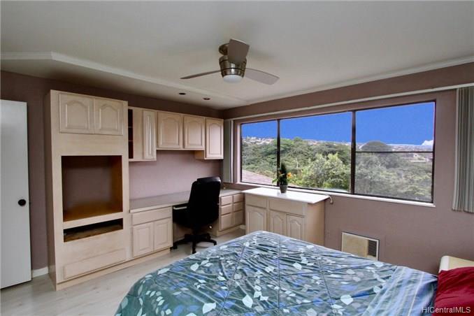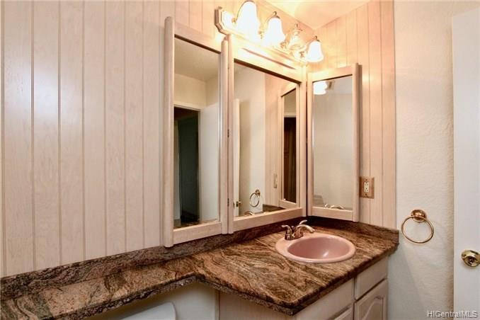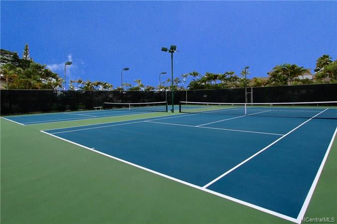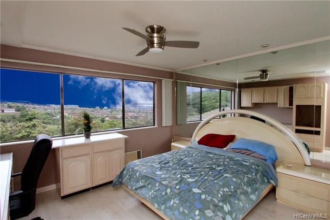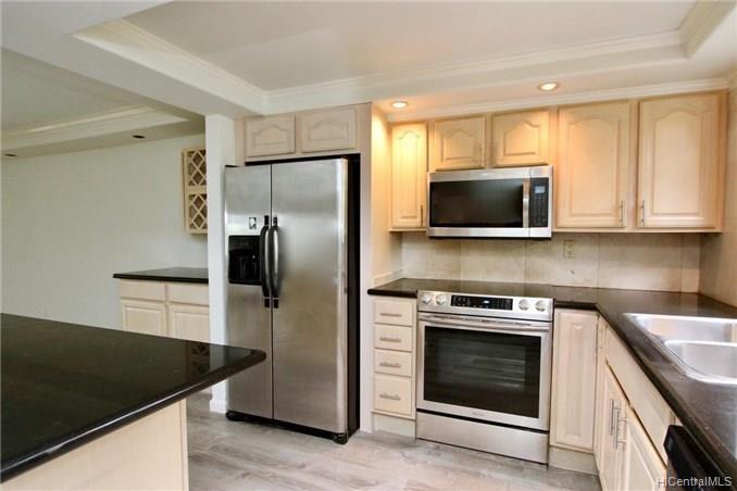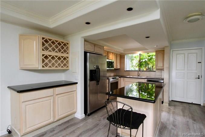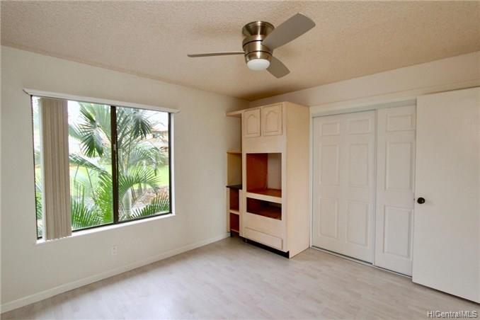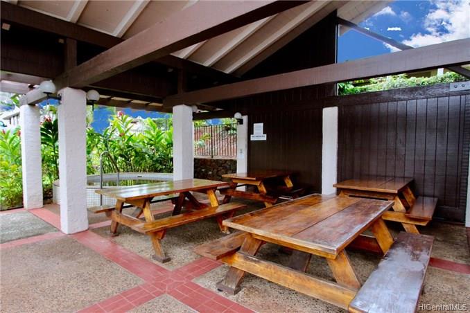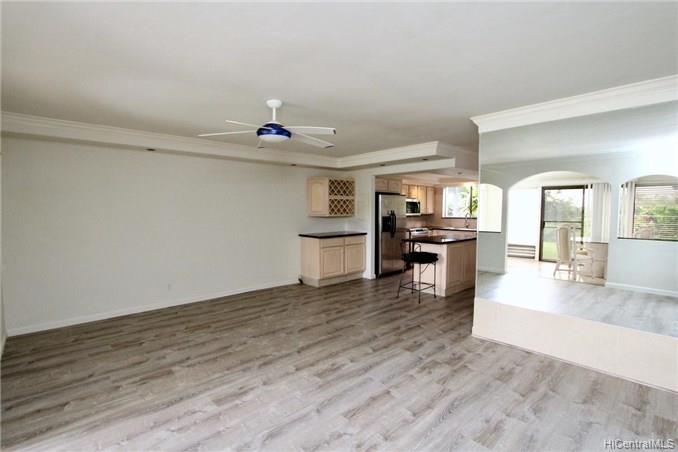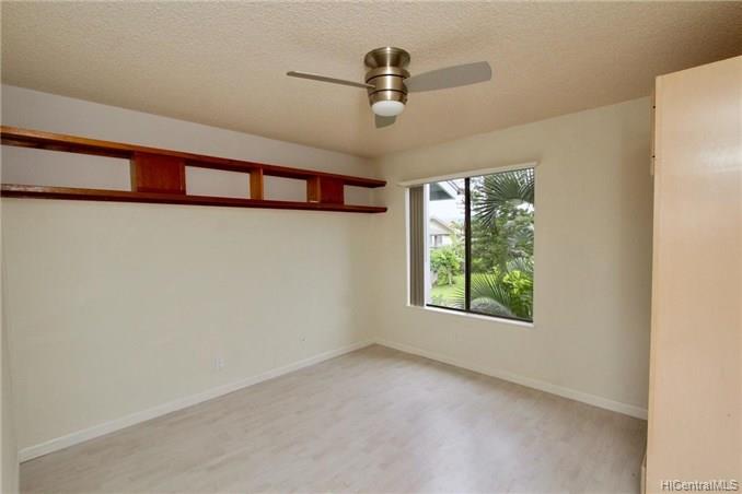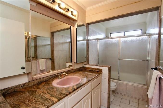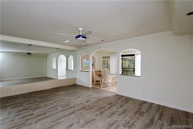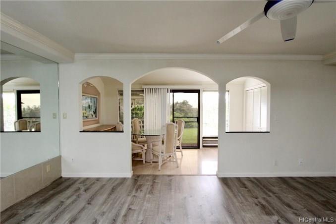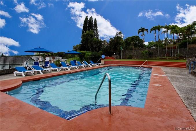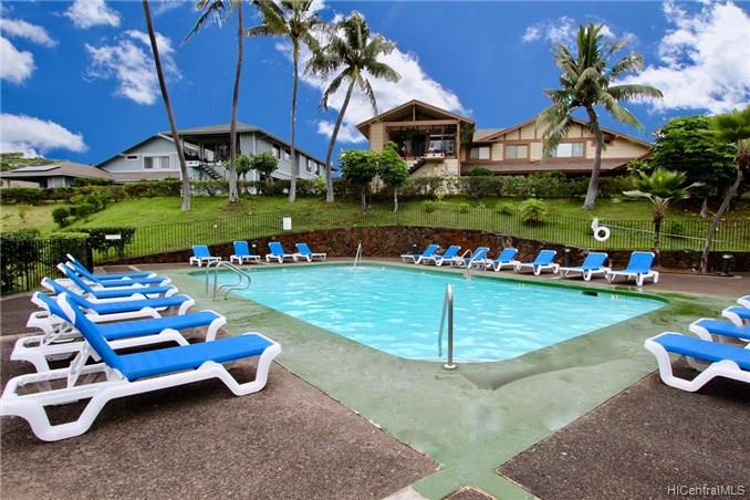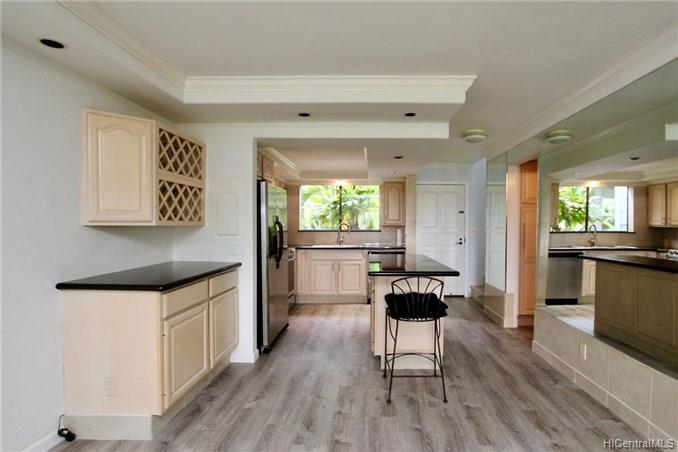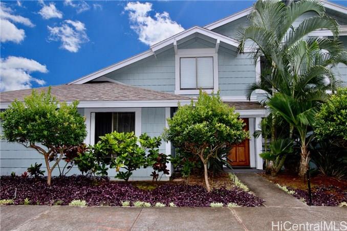 Mountain views, city and ocean views welcome you home to this convenient Pearl City location! This home includes recently updated kitchen, new laminate wood flooring and enclosed lanai for extra SF with open floor plan. The popcorn ceilings have been removed in all rooms but one and home has been upgraded with crown molding. Extra cabinets and built in desk have been added for extra storage. Your new home also has a 1 car garage and 1 uncovered parking in front of your unit. Great complex with rec area, 2 pools, whirlpool, tennis courts and walking trail. Conveniently located near freeway entrance, Pearlridge mall and restaurants.