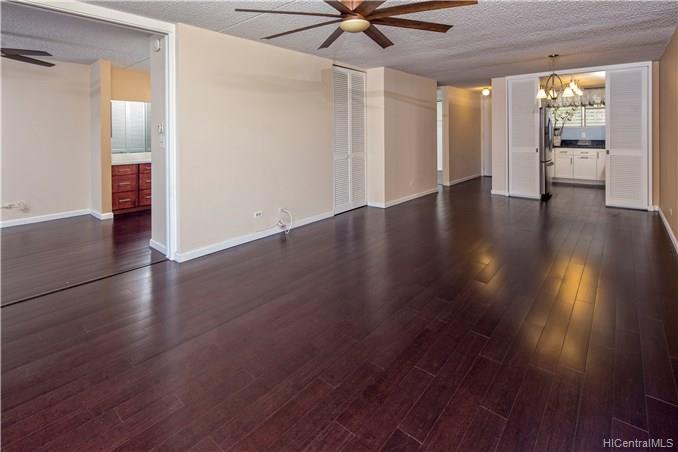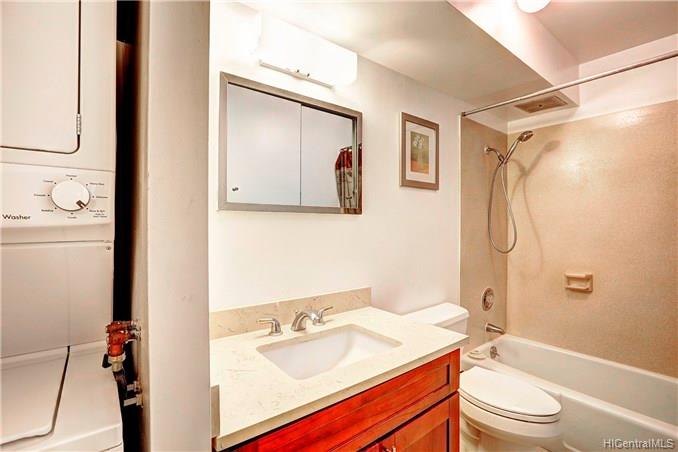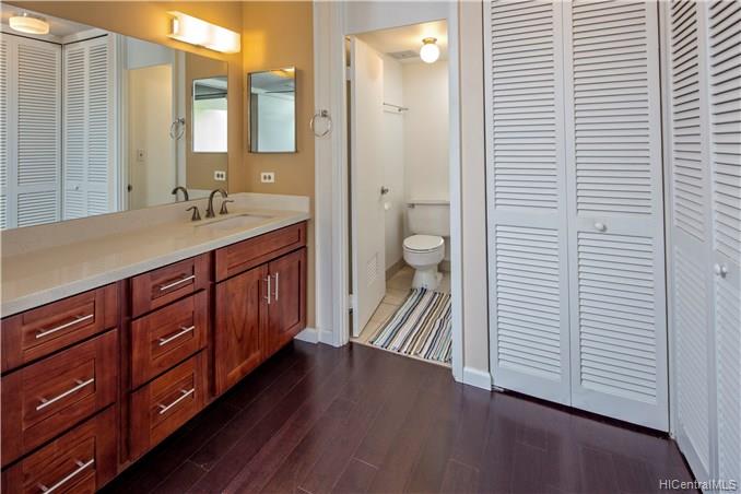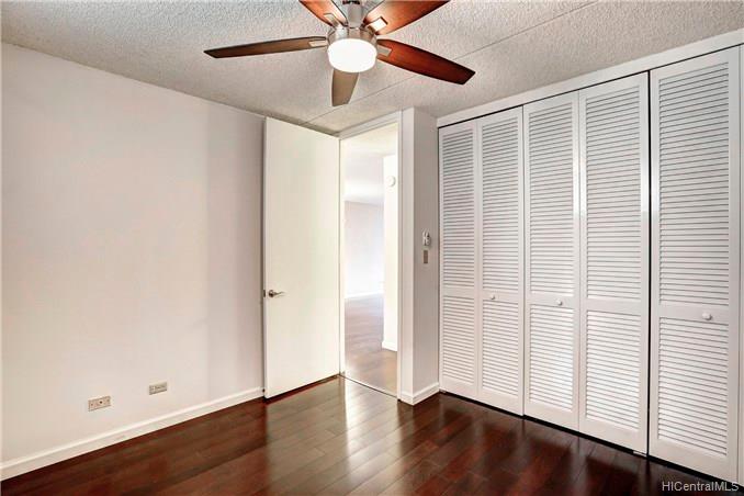 This gorgeously upgraded 2 bed 2 bath boasts a luxuriously sleek wood floor and modern kitchen counters and beautiful cabinets. Newer appliances, spacious floor plan with large lanai and extra storage. A rare treasure, this professionally maintained building rests on over 2.5 acres and soaring popularity. The low maintenance fee covers great amenities including: heated pool, gym, sauna, putting green, surf board storage, library, 24 hours security, guest parking stalls, garden,pond, recreation area and many more. Convenient location close to grocery stores, Waikiki Beach, Ala Moana shopping center, restaurants.