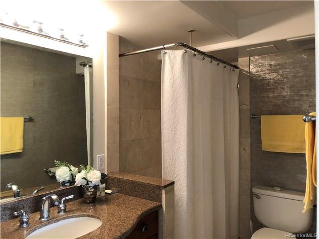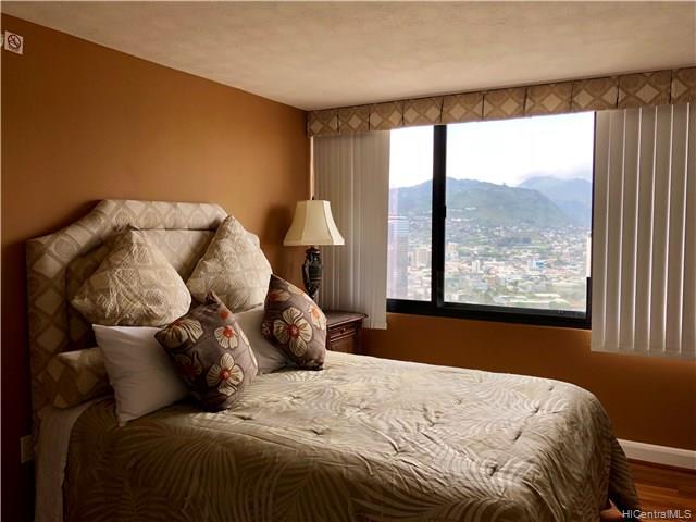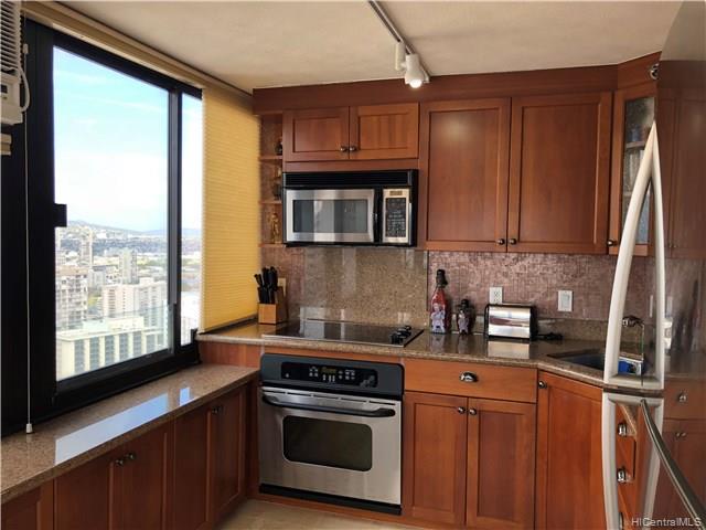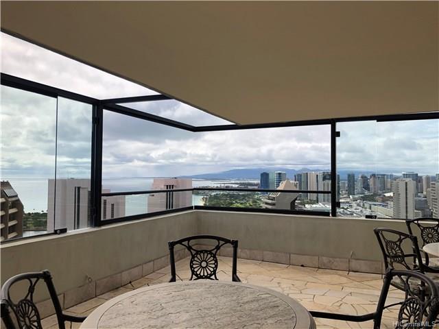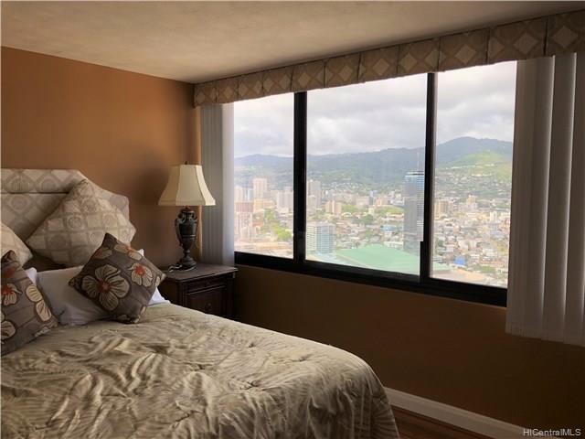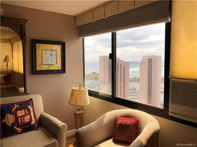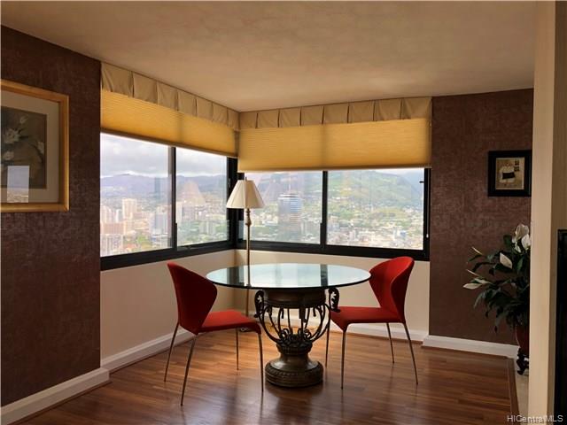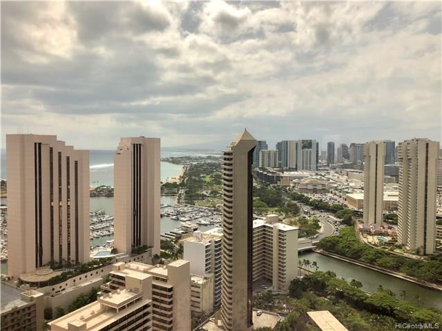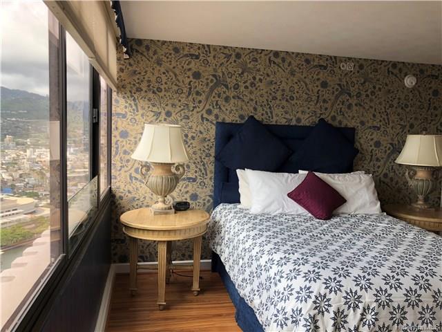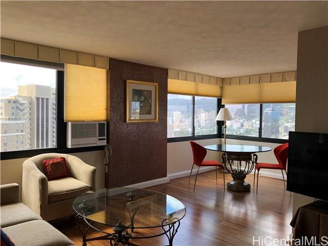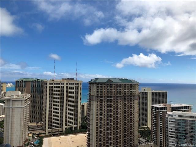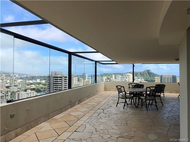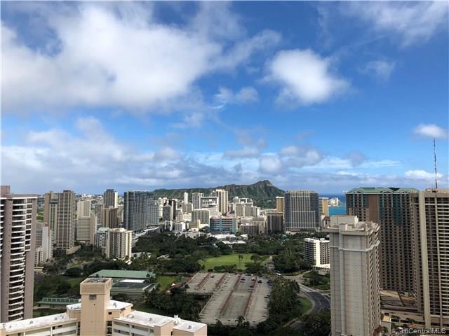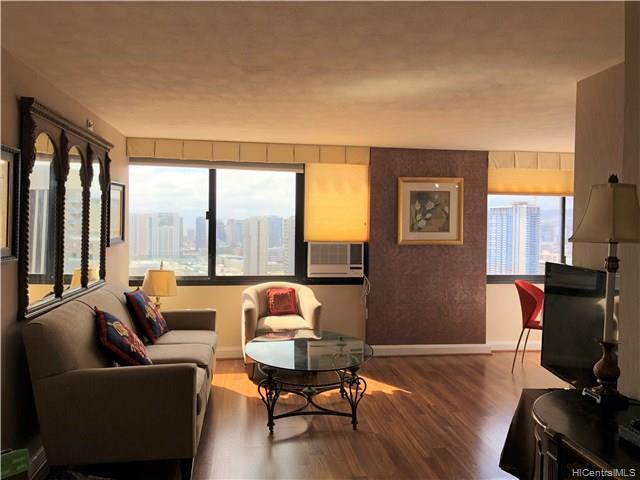 Fully furnished and moved in ready. This near the top corner-end unit offers spectacular ocean, diamond head and colorful city views through out. Features include brand new engineering wood flooring, bedroom with full bath, large closet. Great amenities located on the building’s rooftop with 360 degree views of Honolulu. BBQ area; swimming pool, exercise room……Excellent location close to shopping center, walking distance to the beach, restaurant and other entertainment and business area.