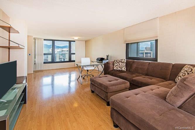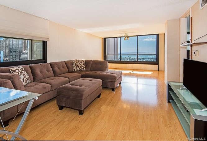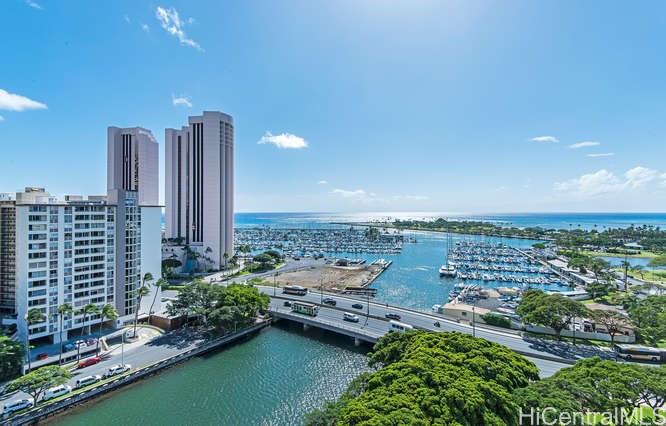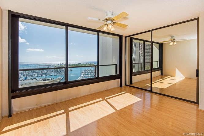 Enjoy amazing views and central AC from this corner unit in Yacht Harbor Towers with 2 PARKING! The spacious floor plan features bedrooms on opposite ends of the unit, and an enclosed lanai that gives you more living space. Tons of closet space plus an additional storage unit near the side-by-side stalls. Gas range, and the dryer is also gas-powered. Be at the gateway to Waikiki, and walking distance to Ala Moana beach park and shopping center. All utilities – electric, AC, basic cable, gas, hot water, water and sewer – are included in the maintenance fee.
